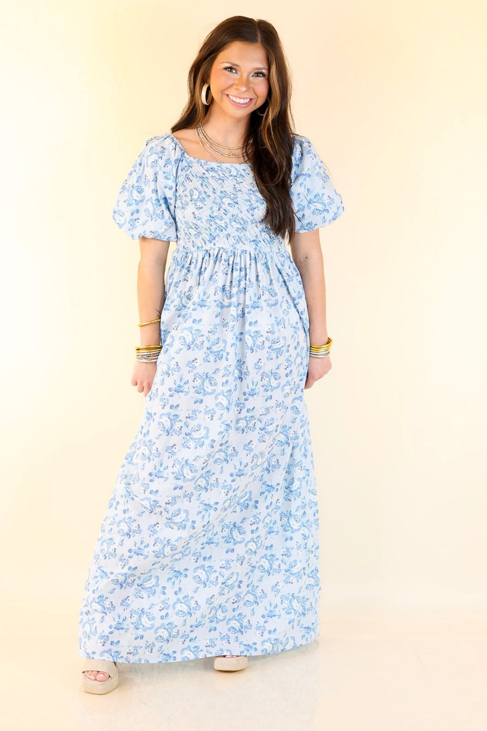 Simply Southern | Ever Enchanting Floral Print Maxi Dress with Short Puff Sleeves in Light Blue