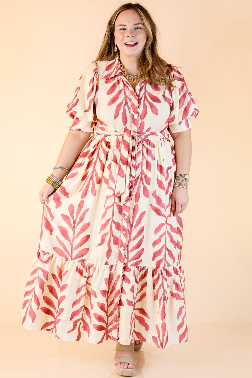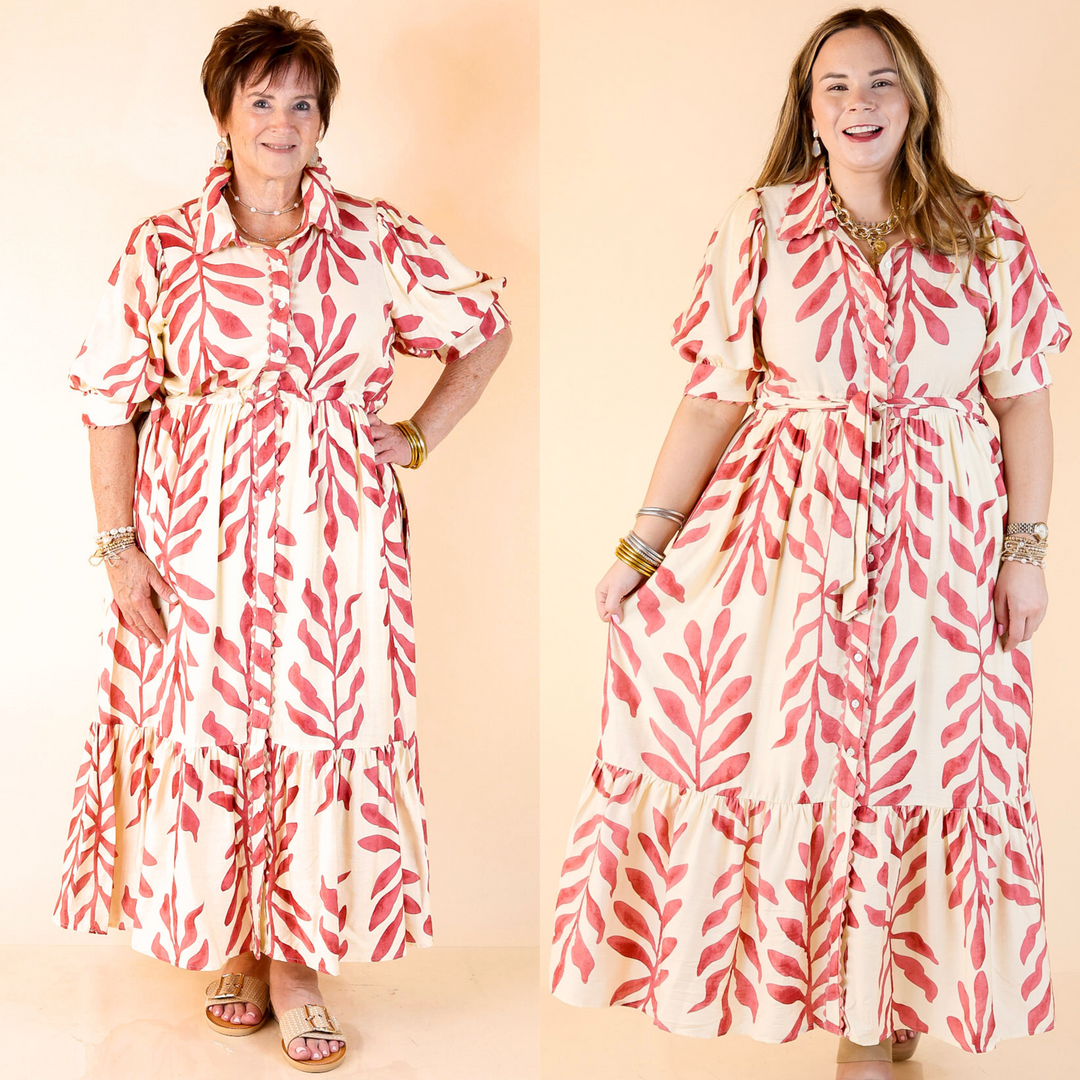 Class Act Botanical Print Button Up Maxi Dress with Short Puff Sleeves in Cream