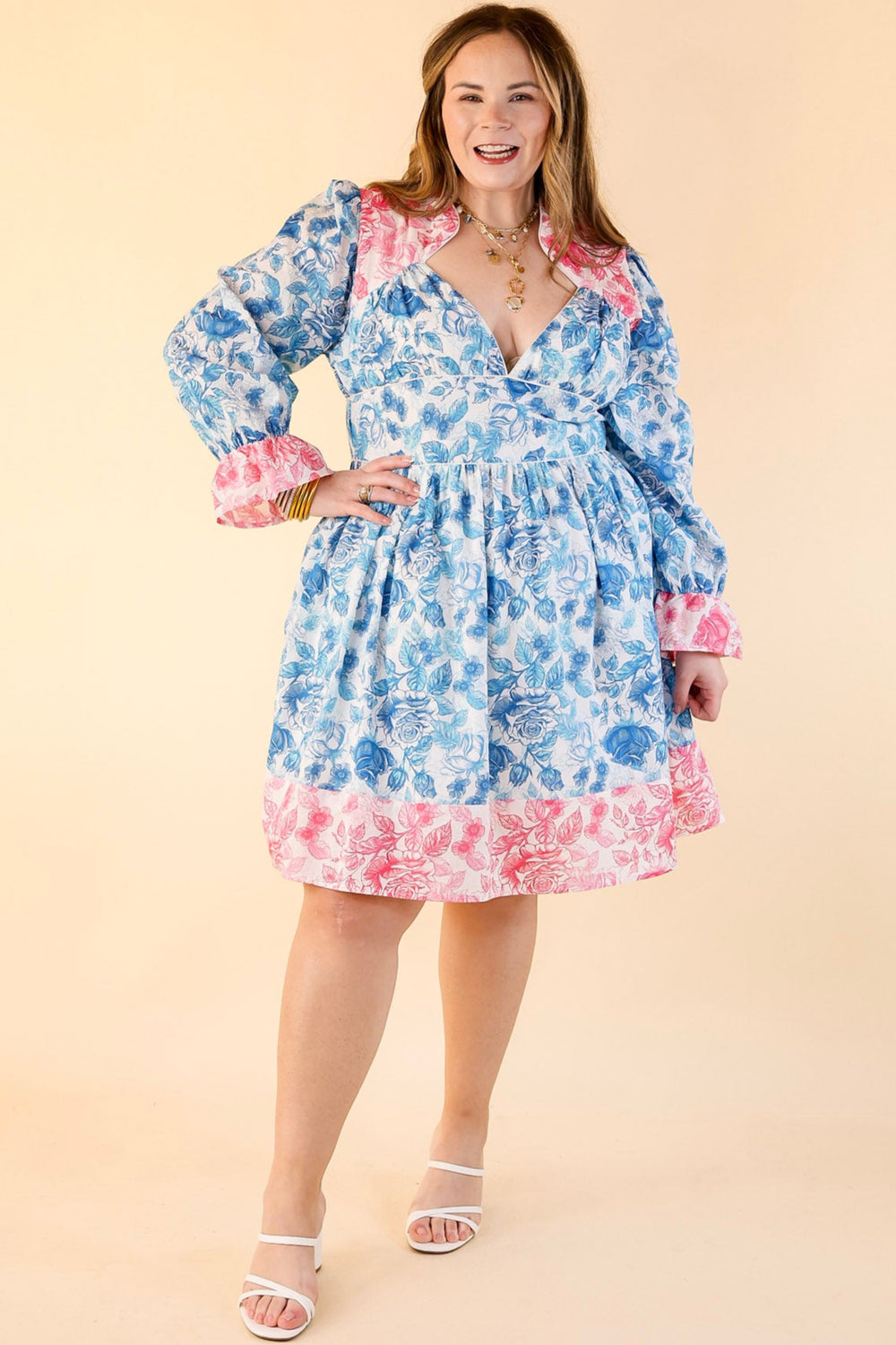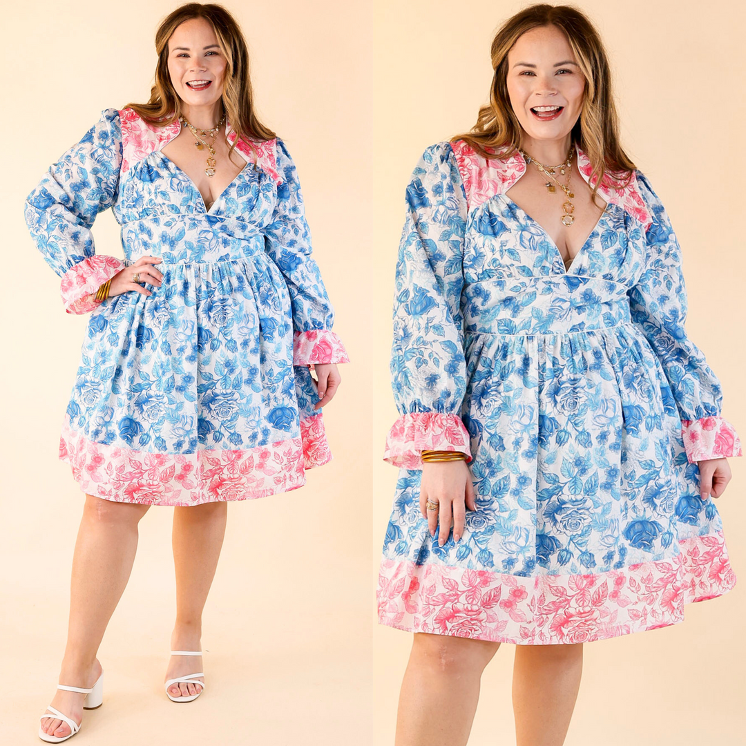 Lovely as Ever V Neck Floral Print Dress in Blue and Pink Mix