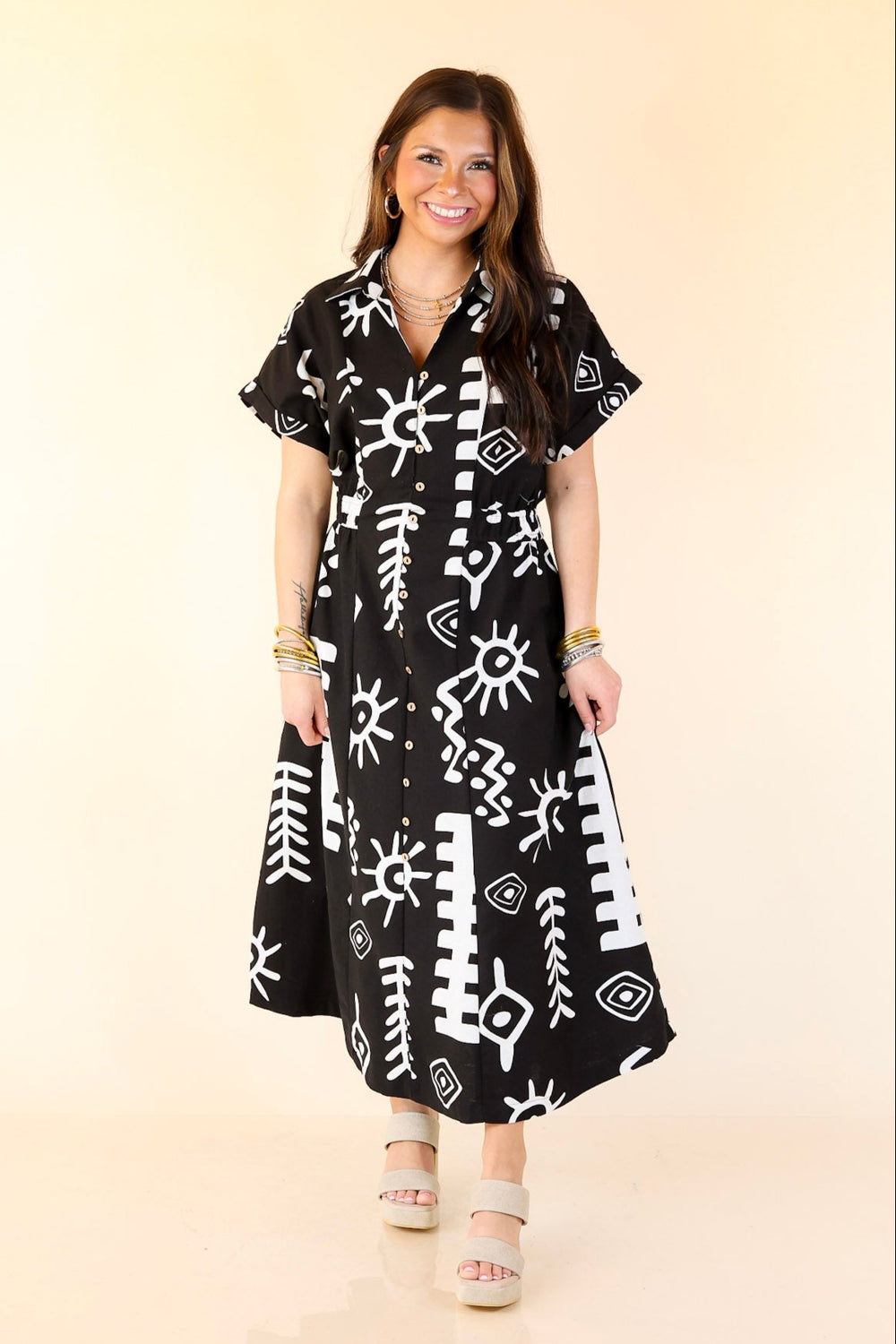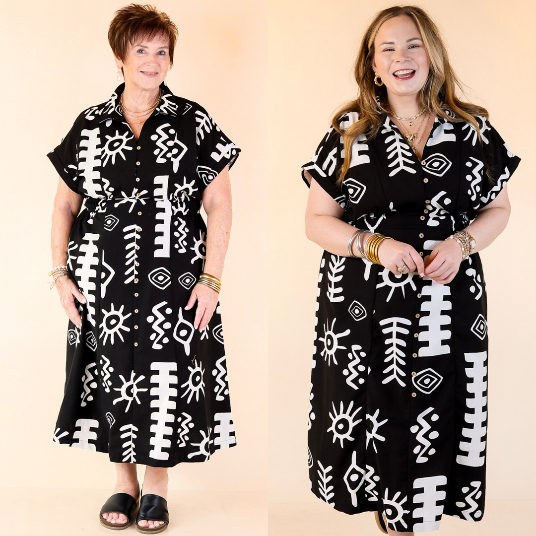 Make Your Mark Abstract Print Button Down Midi Dress in Black