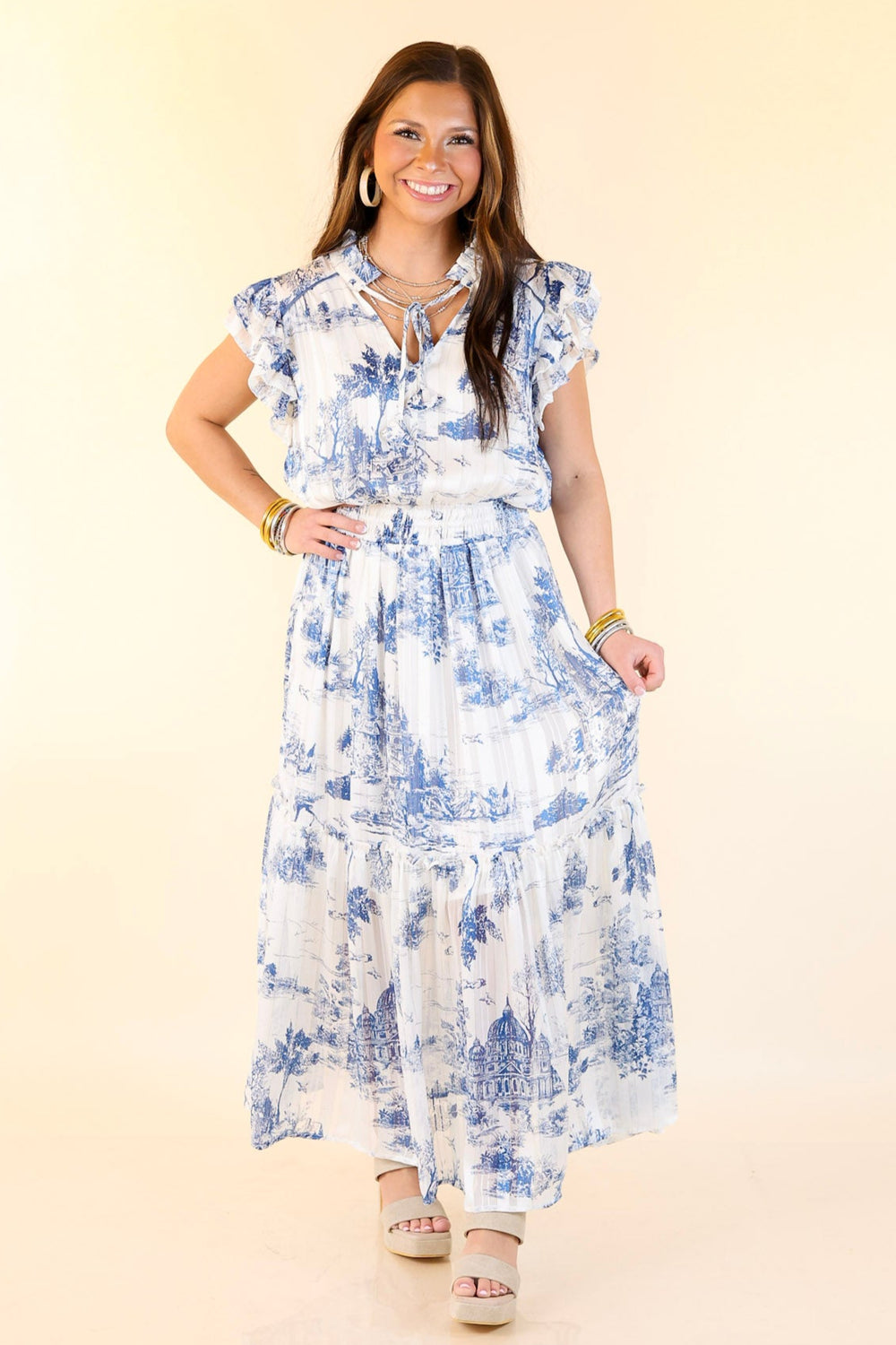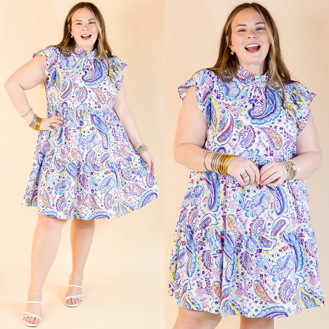 Dance Around Floral and Paisley Print Dress with Ruffle Upper in Blue Mix