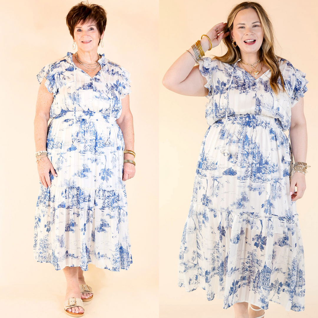 Timeless Blossom Floral Print Button Up Dress in Cream and Blue