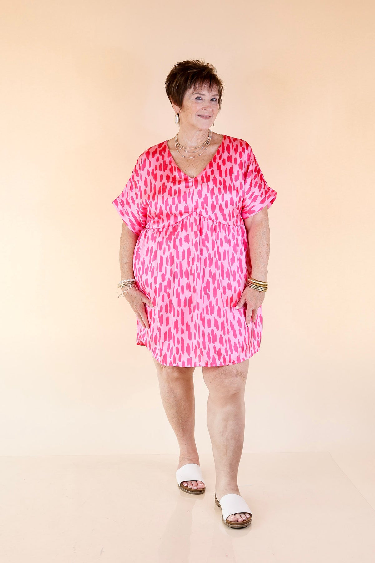This dress is the perfect Spring statement! It includes a v neck, short sleeves, a babydoll style fit, and a hot pink dotted pattern that is adorable on this knee-length dress! Dress is lined.