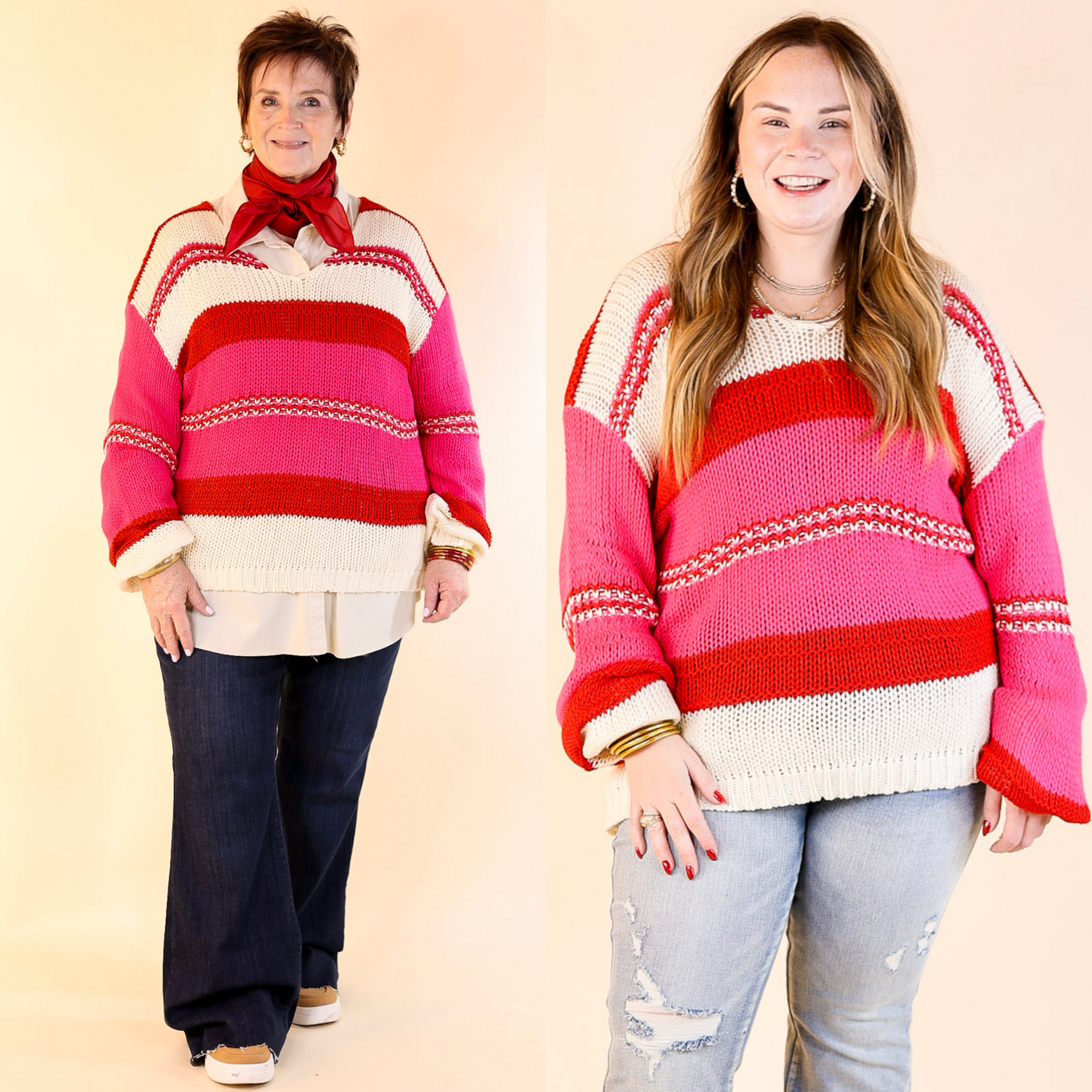 Cozy On Up Long Sleeve Striped Sweater in Red Mix
