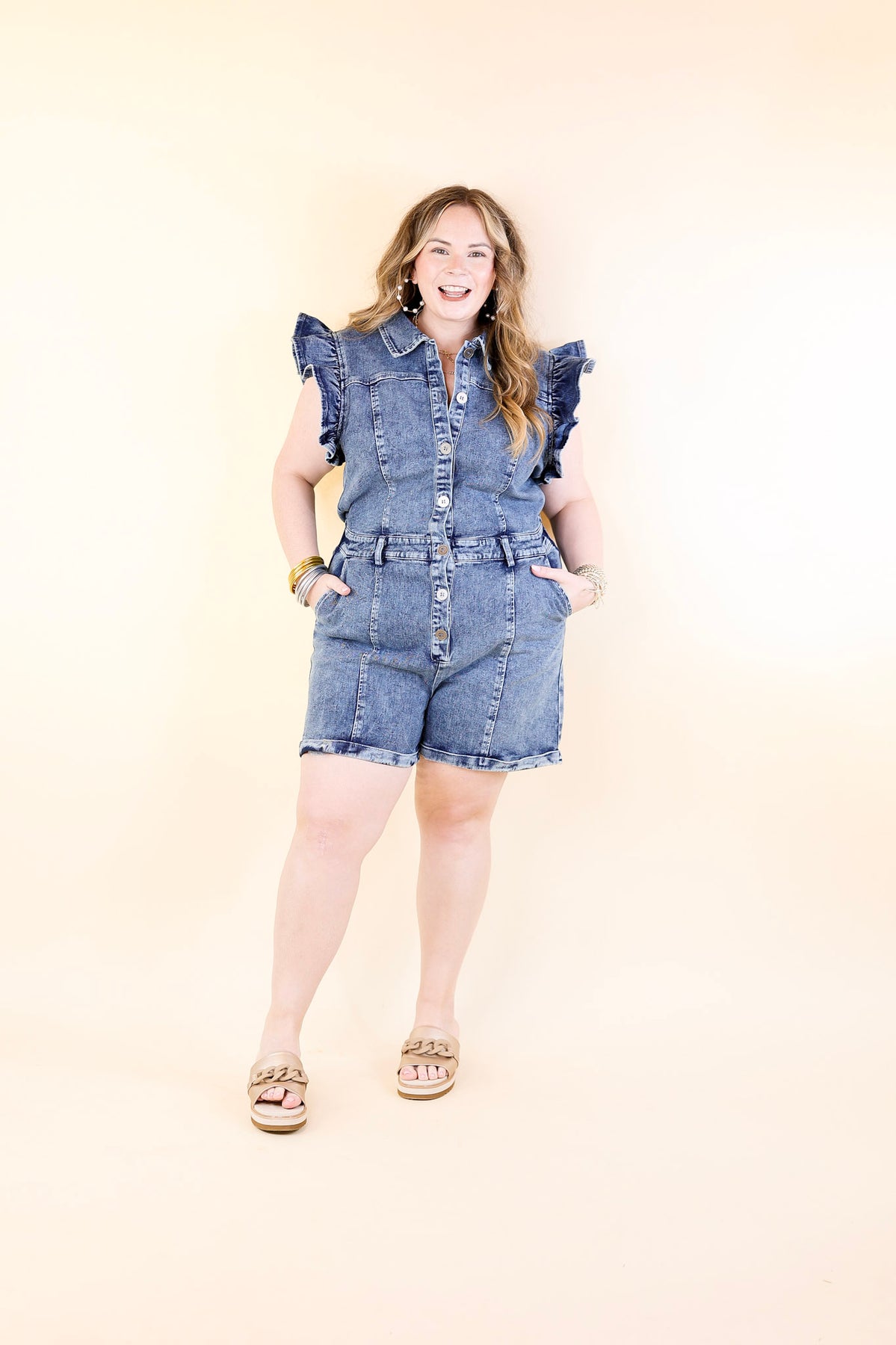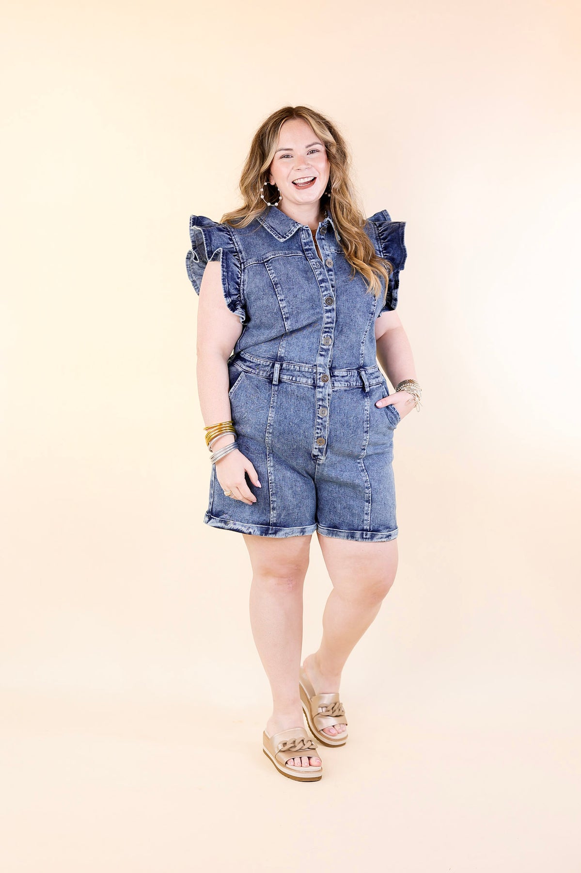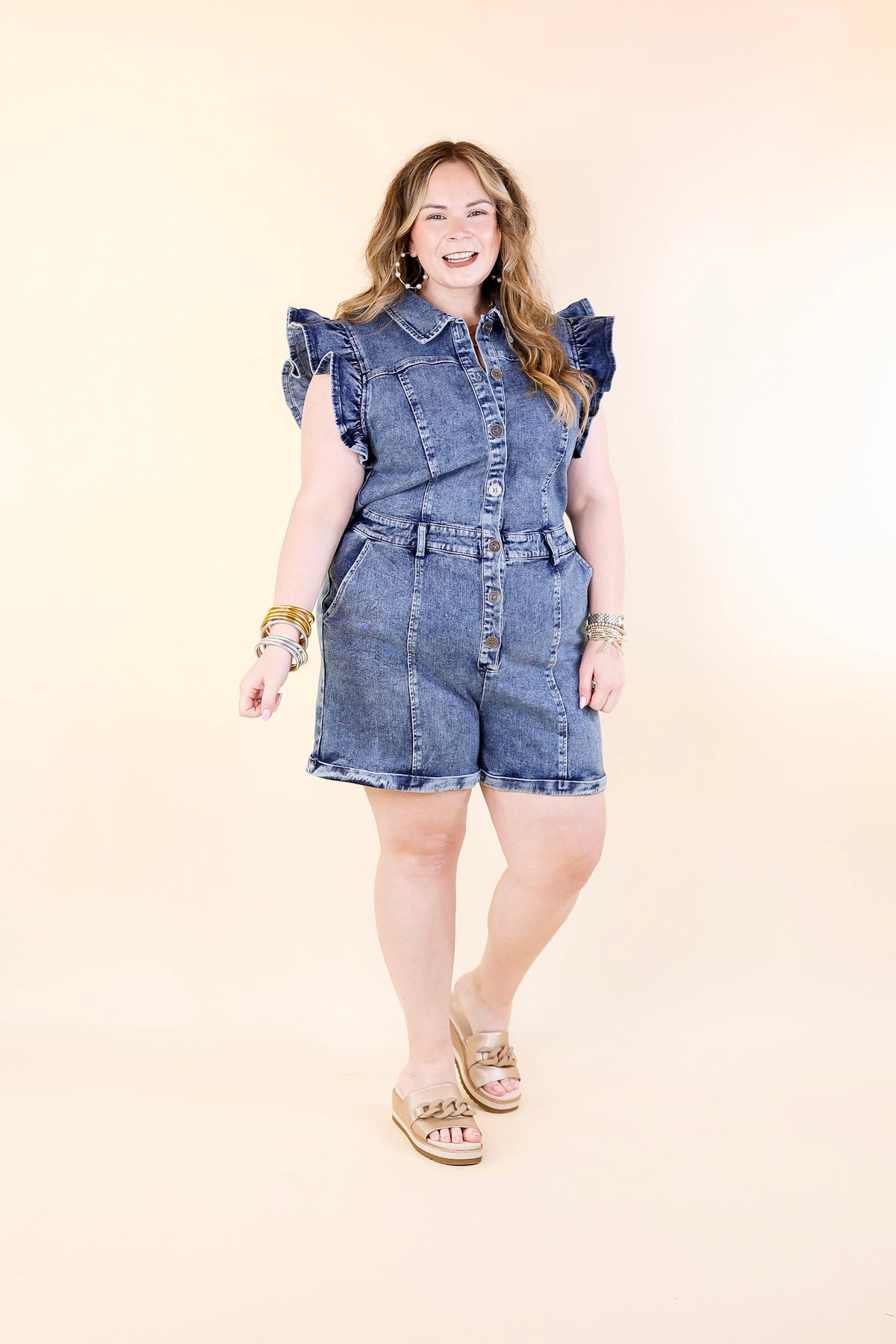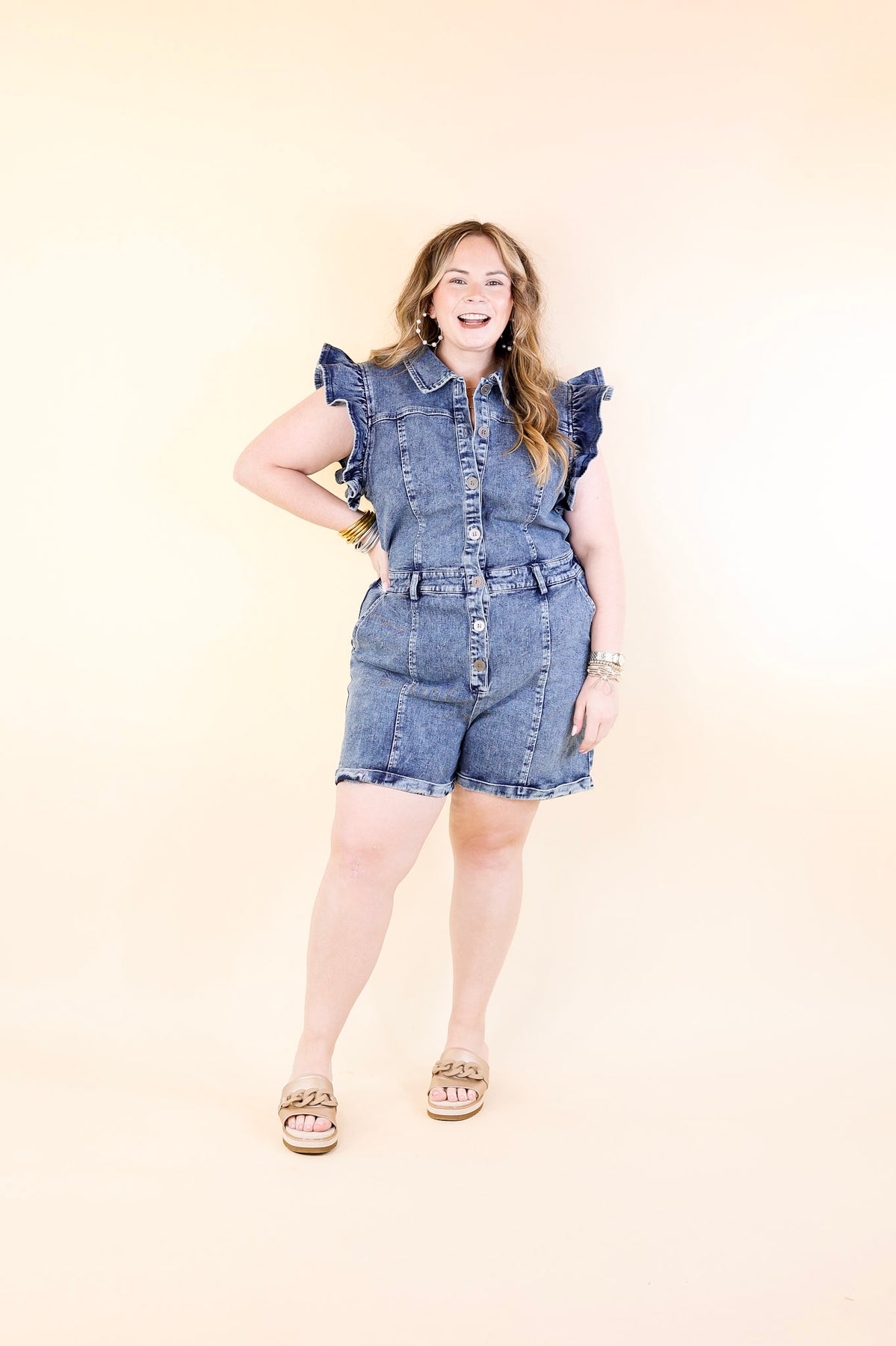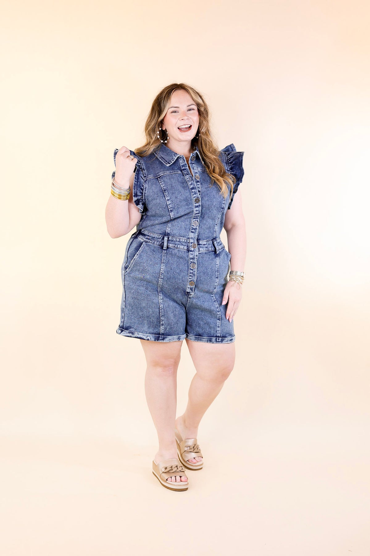 Feminine Flair Denim Romper with Ruffles and Collar in Medium Wash