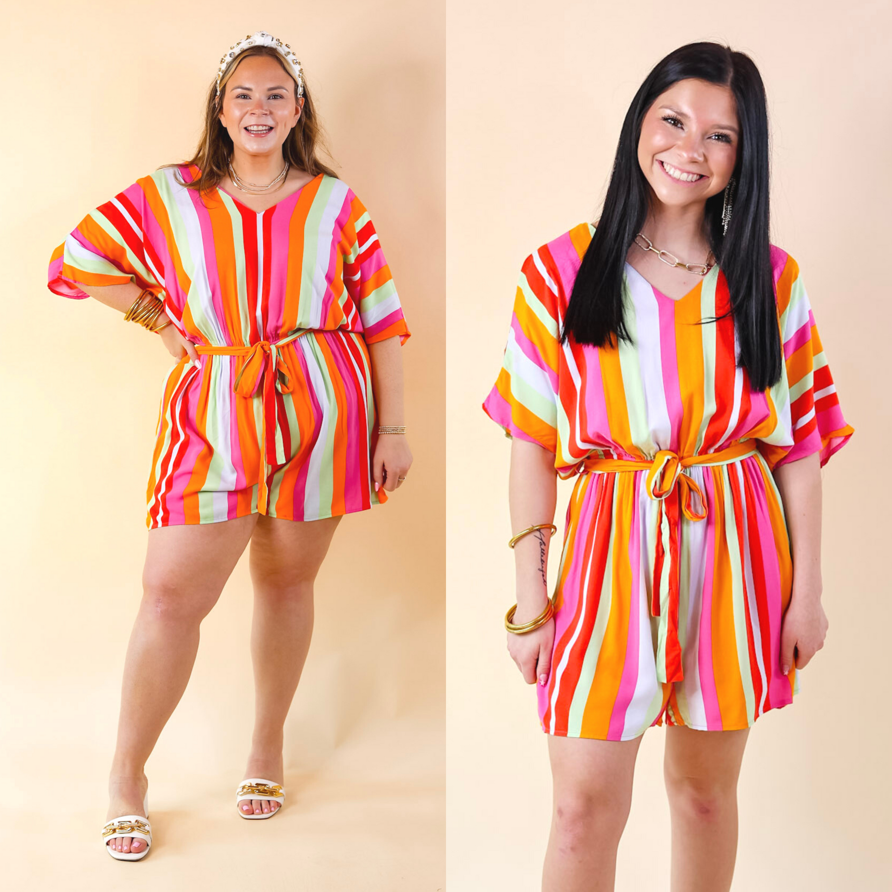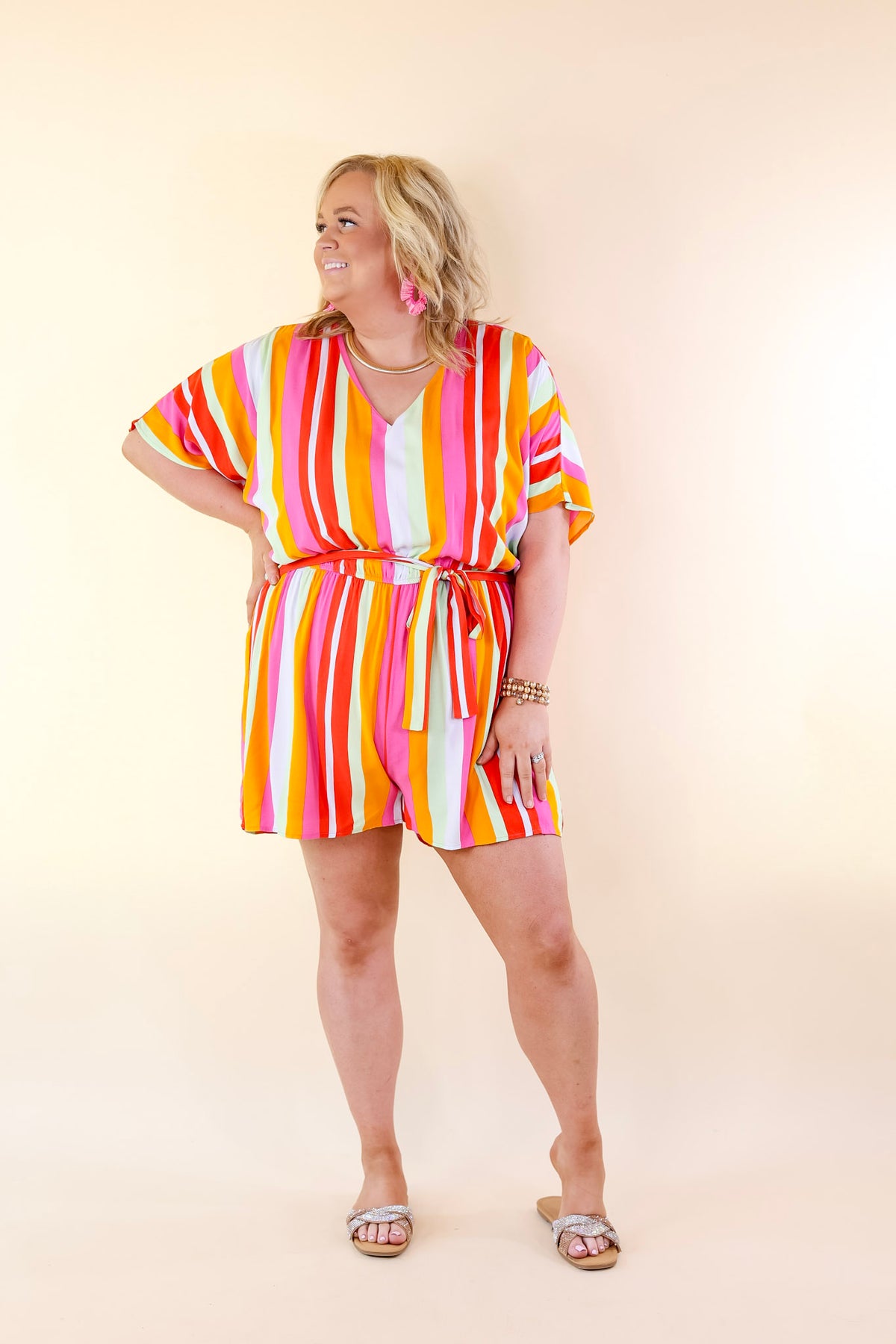 This romper is perfect in the sun and in the shade! It includes a v neckline, short sleeves, an elastic natural waist with an optional tie, and a cute striped print in pink, orange, green, and light blue. Pair this with wedges for a Spring look! Inseam measures 2.5 inches long.