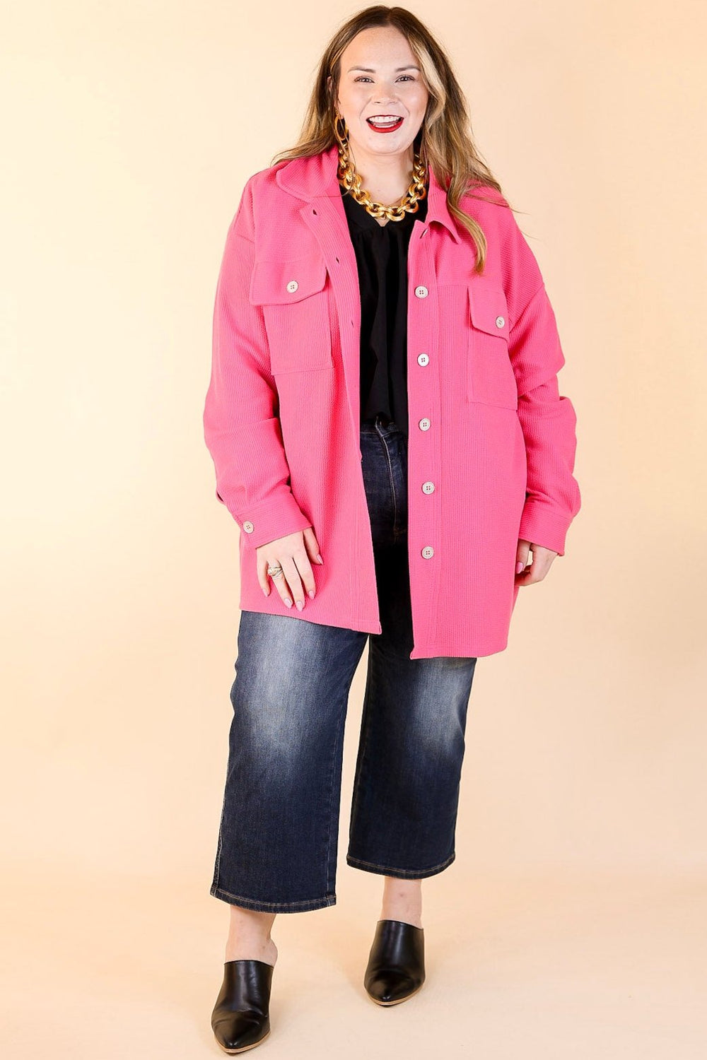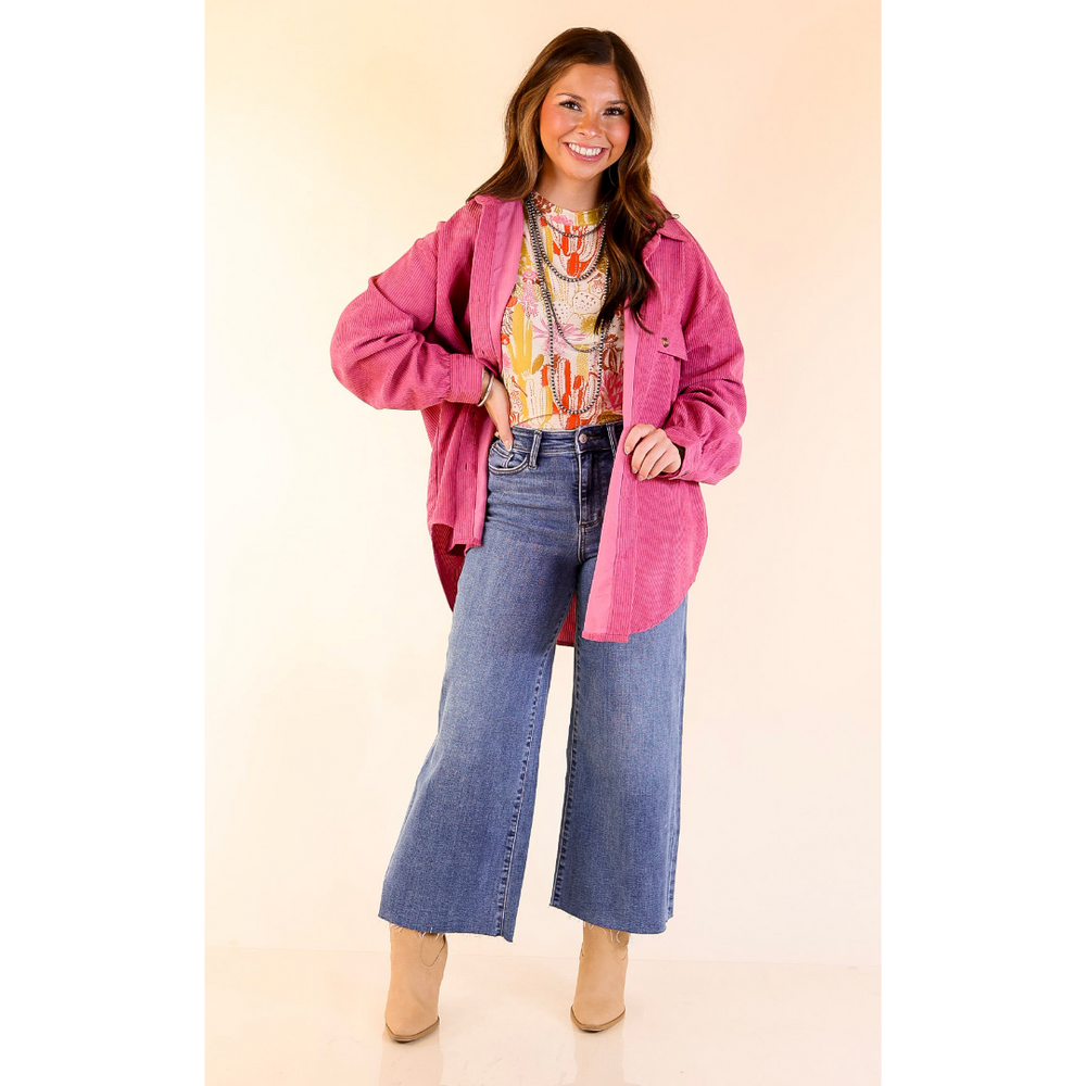 Dial It In Button Up Corduroy Shacket with Raw Hem in Pink
