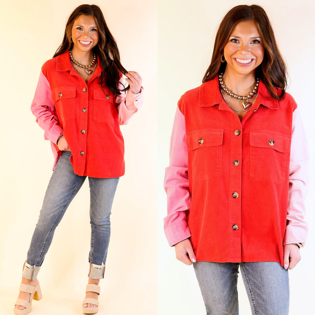 Kind Smiles Button Up Corduroy Color Block Shacket in Red and Pink