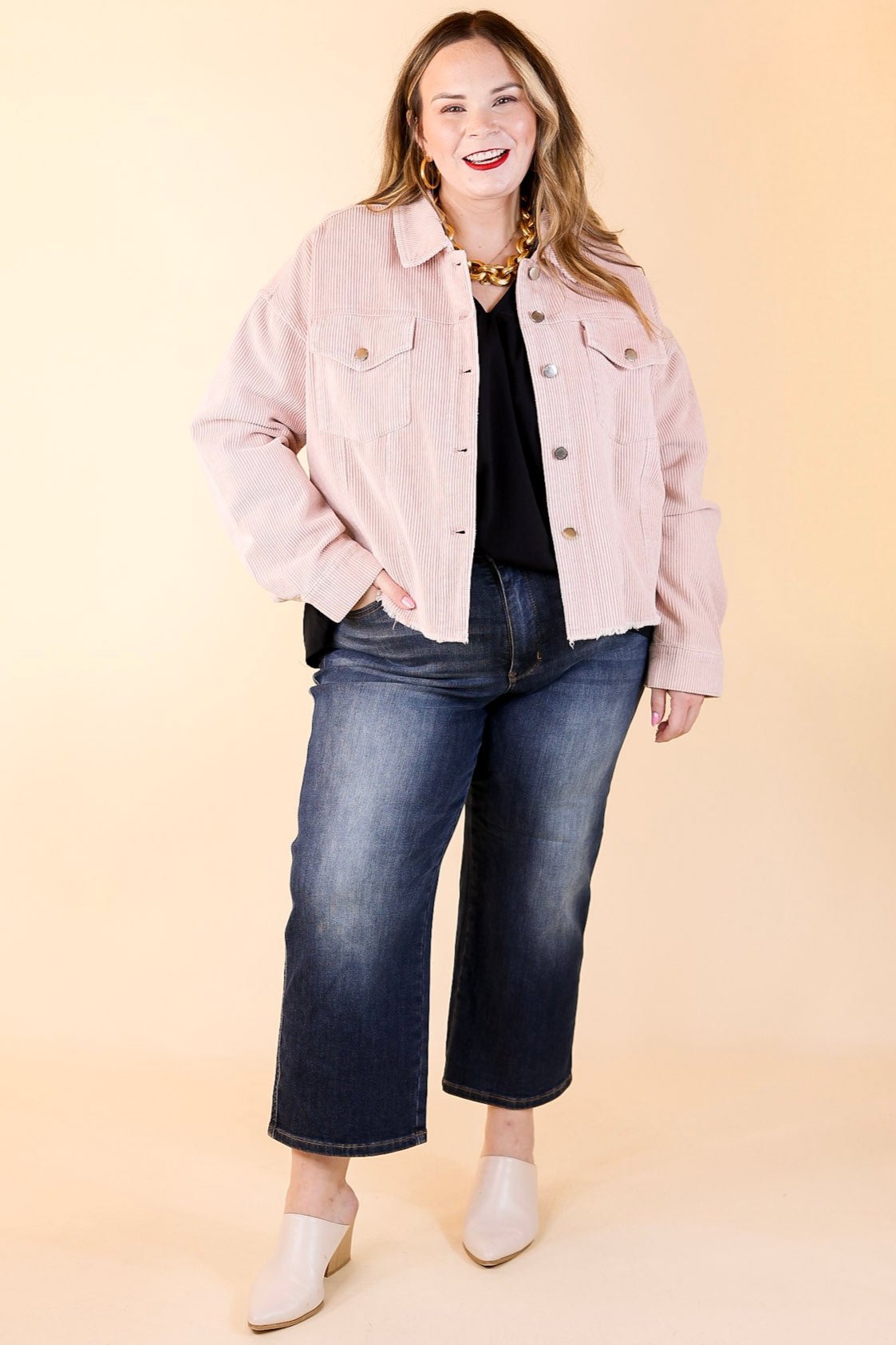Edgy and Chic Button Up Corduroy Jacket with Raw Hem in Blush Pink