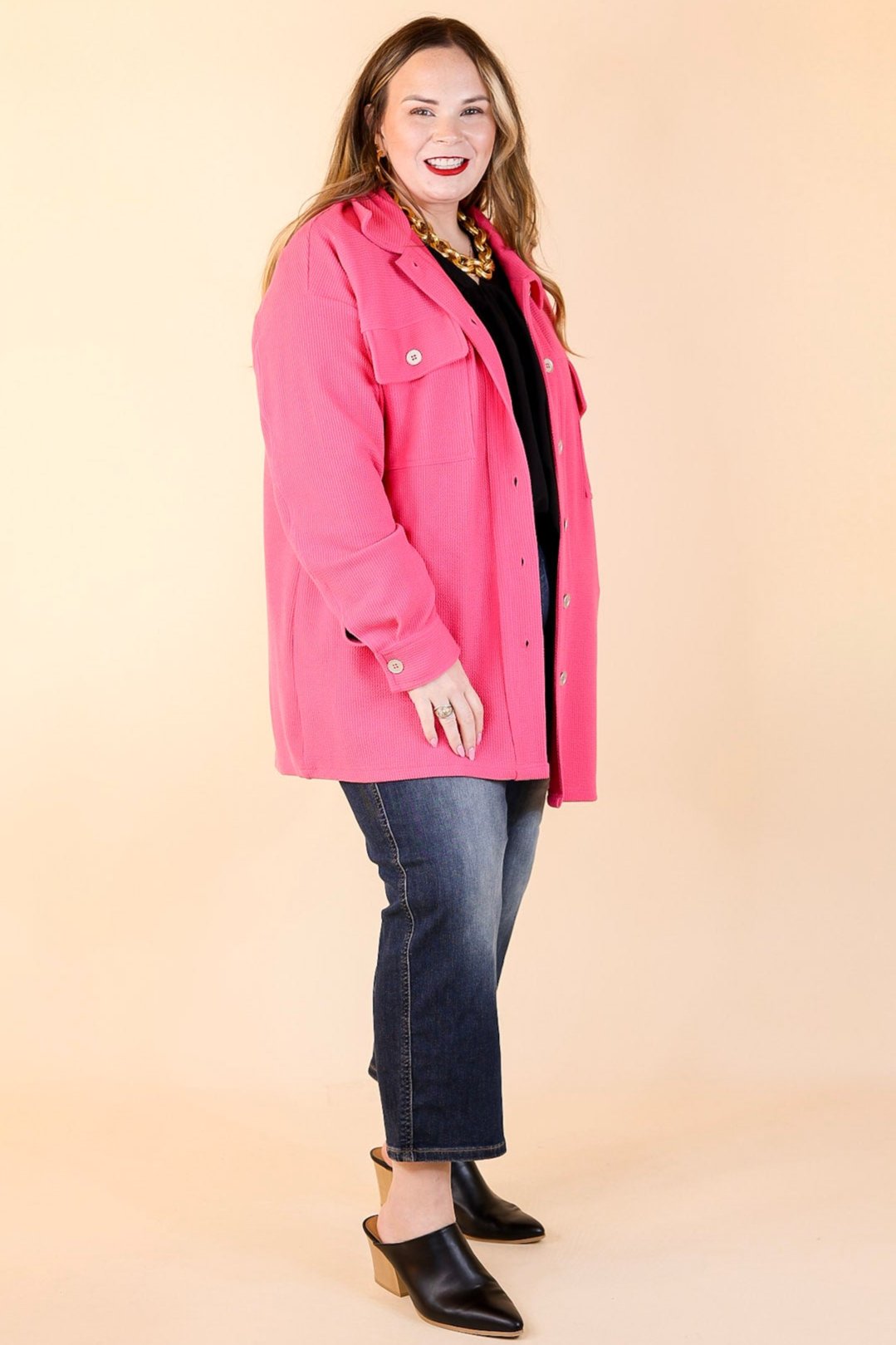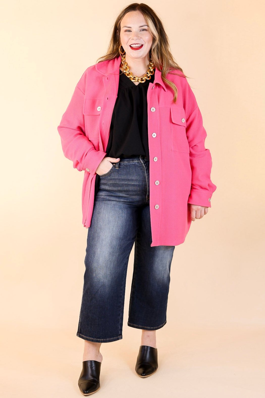 Say Less Button Up Knit Shacket in Fuchsia Pink