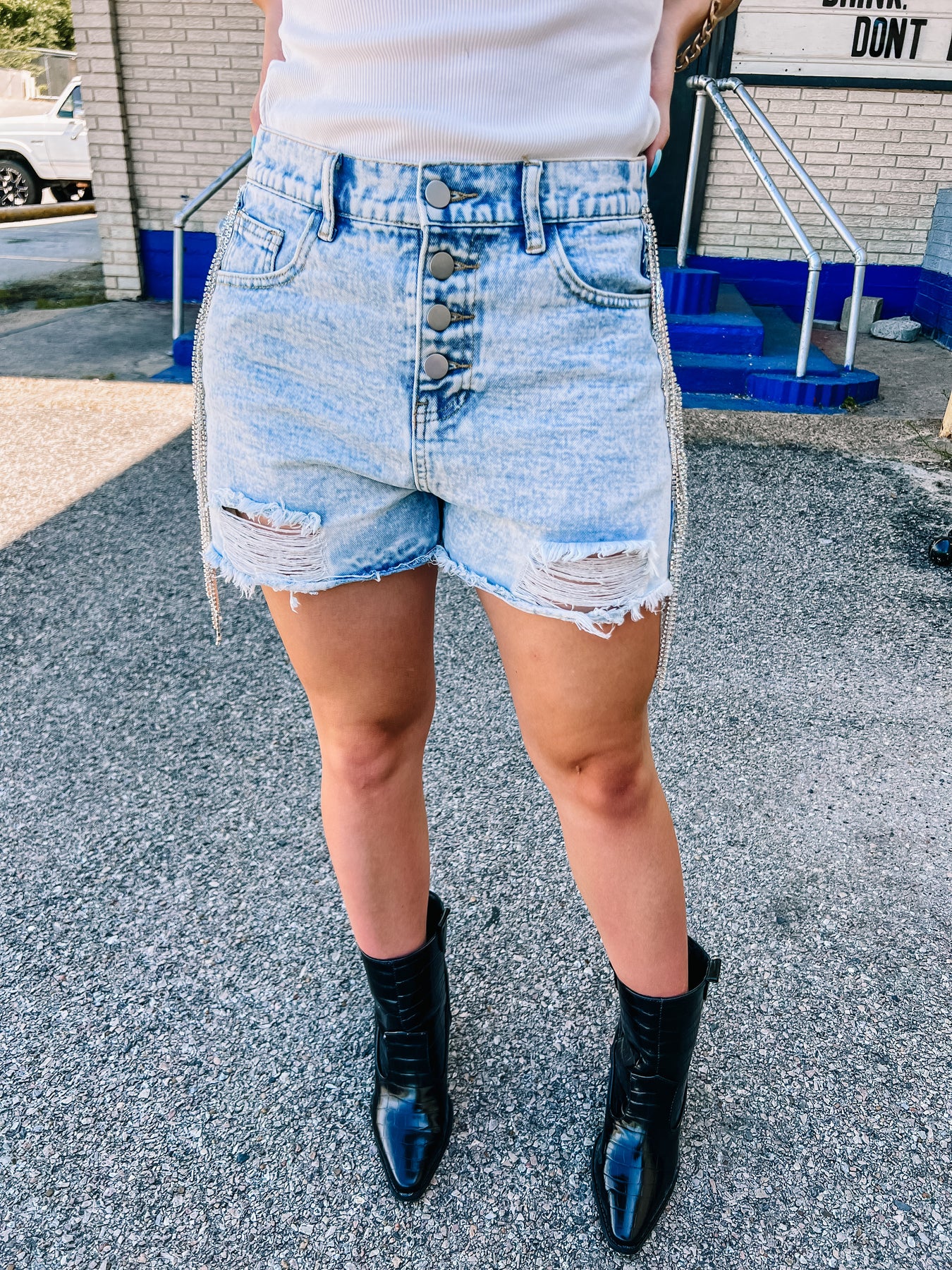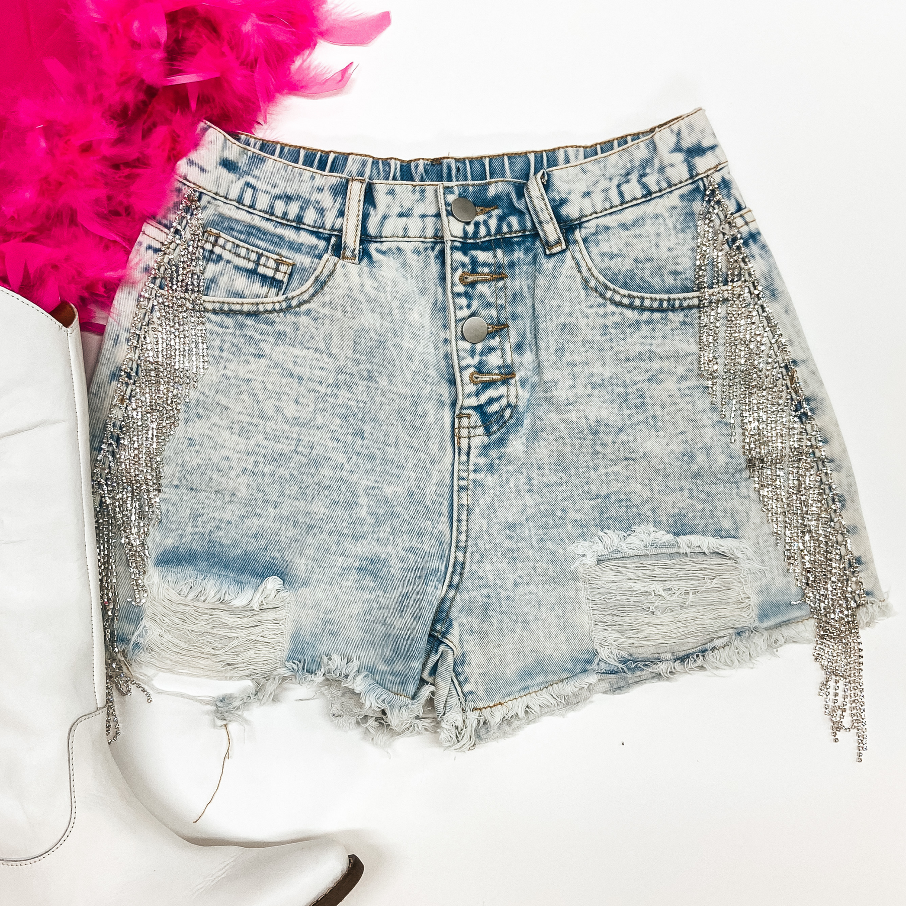Broadway Girls Crystal Fringe Distressed Denim Shorts in Light Wash