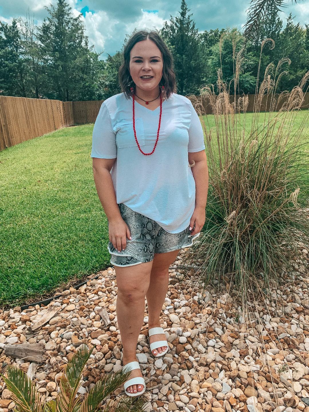You're destined to make "hissstory" in these adorable and comfortable shorts! These shorts include an elastic waist with drawstring, cute ruffles on the side hem with a pom pom trim, and an adorable black and white snake print. These are the perfect piece for lounging at the beach or running around town!