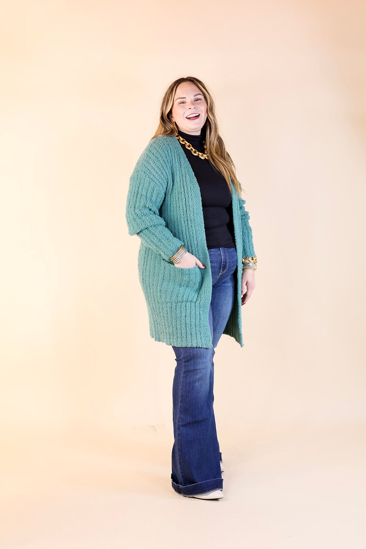 Cold Brew And Cuddles Long Sleeve Cardigan with Pockets in Teal