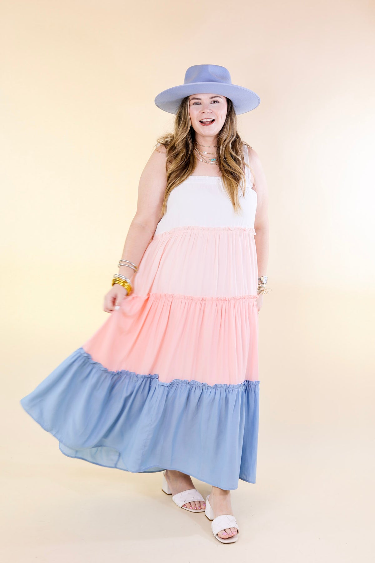 This beautiful dress has us dreaming of a weekend in Capri! It includes a white upper with tank top straps that tie, two pink tiers in the middle, and a baby blue tier at the hemline. Pair it with a hat and wedges and you will be set for the season! Dress is lined.