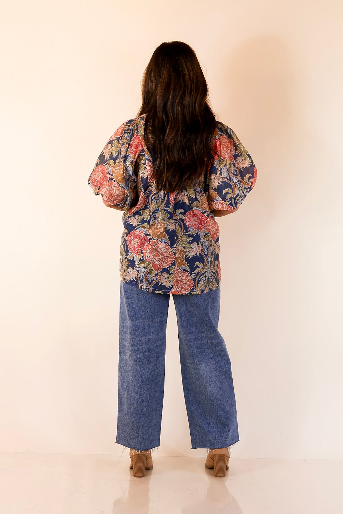 The Blooming Days Ahead V Neck Blouse with Puff Sleeves, Ruffle Collar, and Square Trim in Navy Floral is designed to brighten up your wardrobe. Featuring a bold floral print in coral, gold, and navy hues, this lightweight woven blouse blends playful color with polished detail. The V neckline is framed by square trim and finished with a subtle ruffle collar, while puff sleeves add soft volume. A relaxed, flowy silhouette makes this top just as easy to wear to the office as it is for brunch or weekends out.