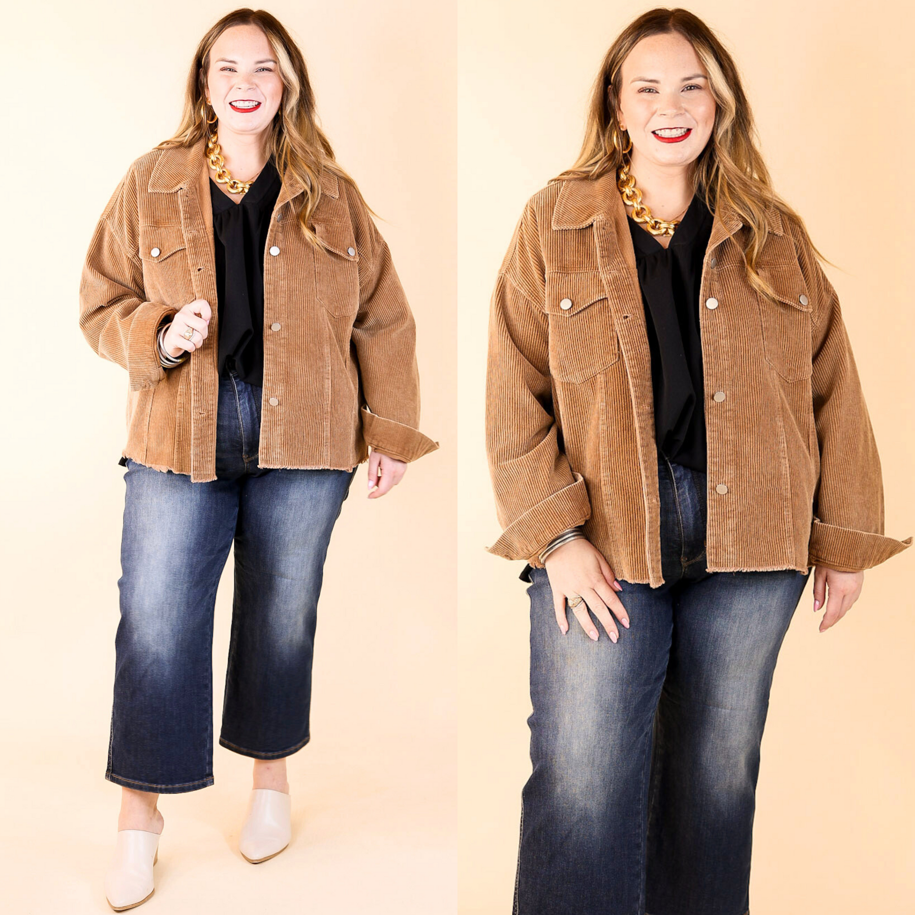 Edgy and Chic Button Up Corduroy Jacket with Raw Hem in Camel Brown