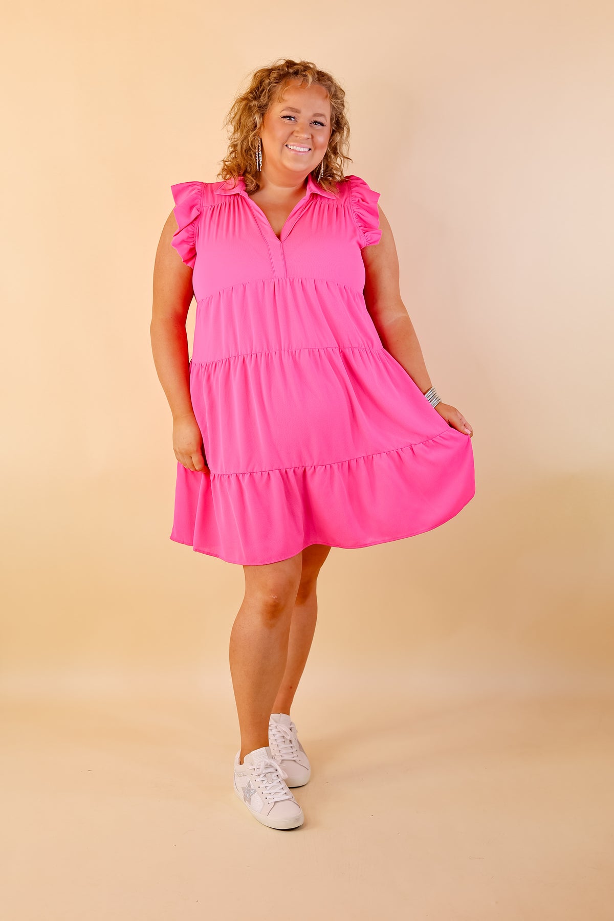 The "All Of A Sudden" dress in hot pink gives you a look that is sure to turn heads! It's perfect for a day out on the town with its ruffle cap sleeves, v neckline, and tiered skirt. Definitely a dress you'll want to add to your wardrobe ASAP!