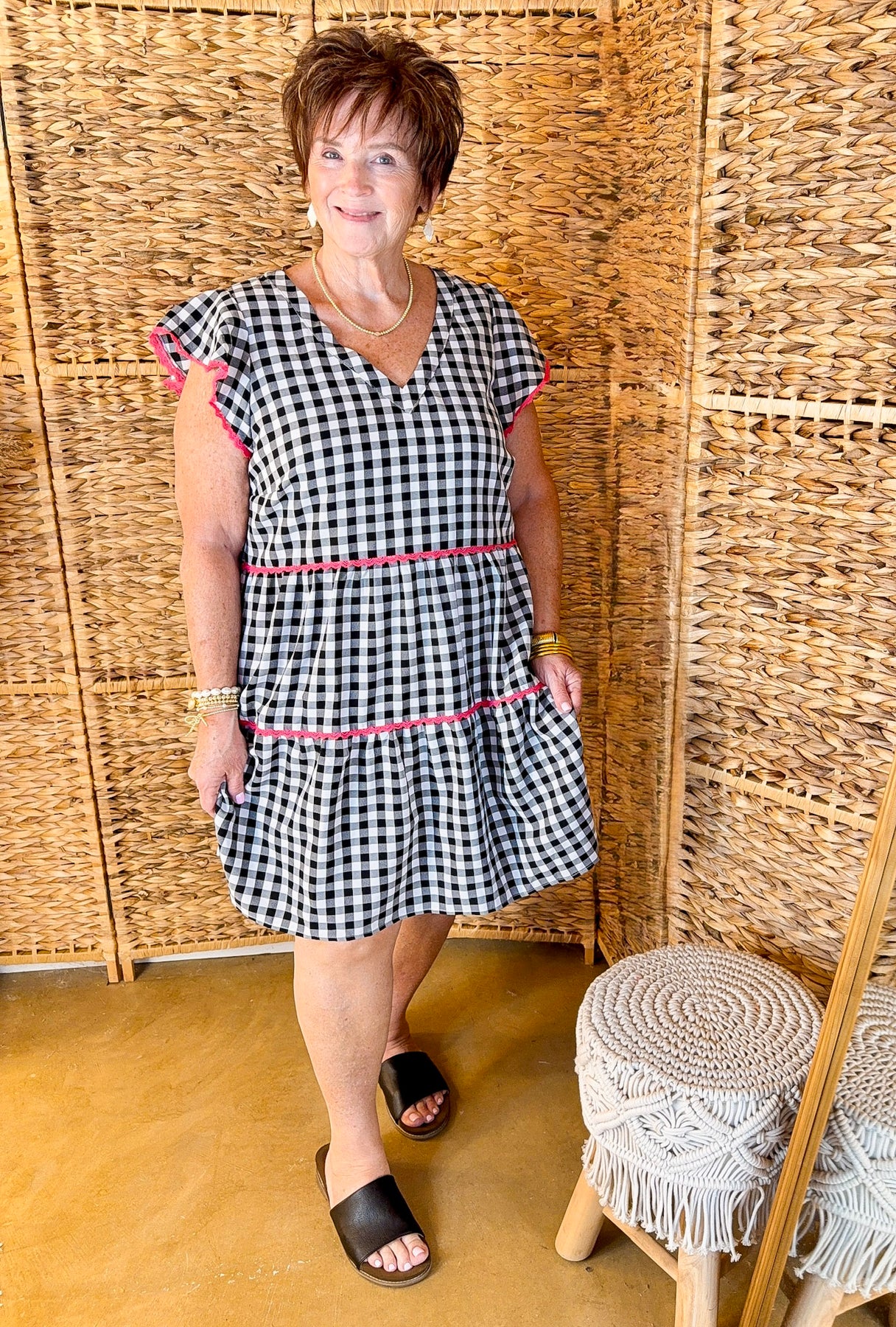 Flirty Mood Gingham Ruffle Tiered Dress with Pink Lace Trim
