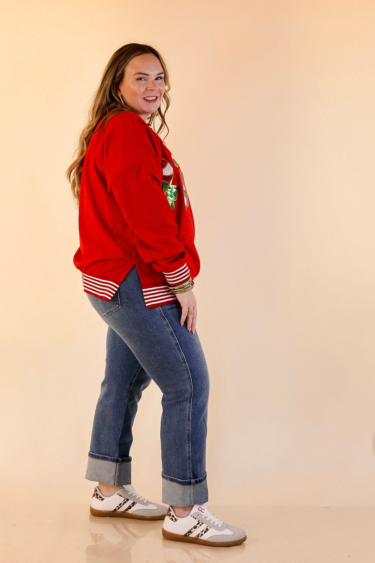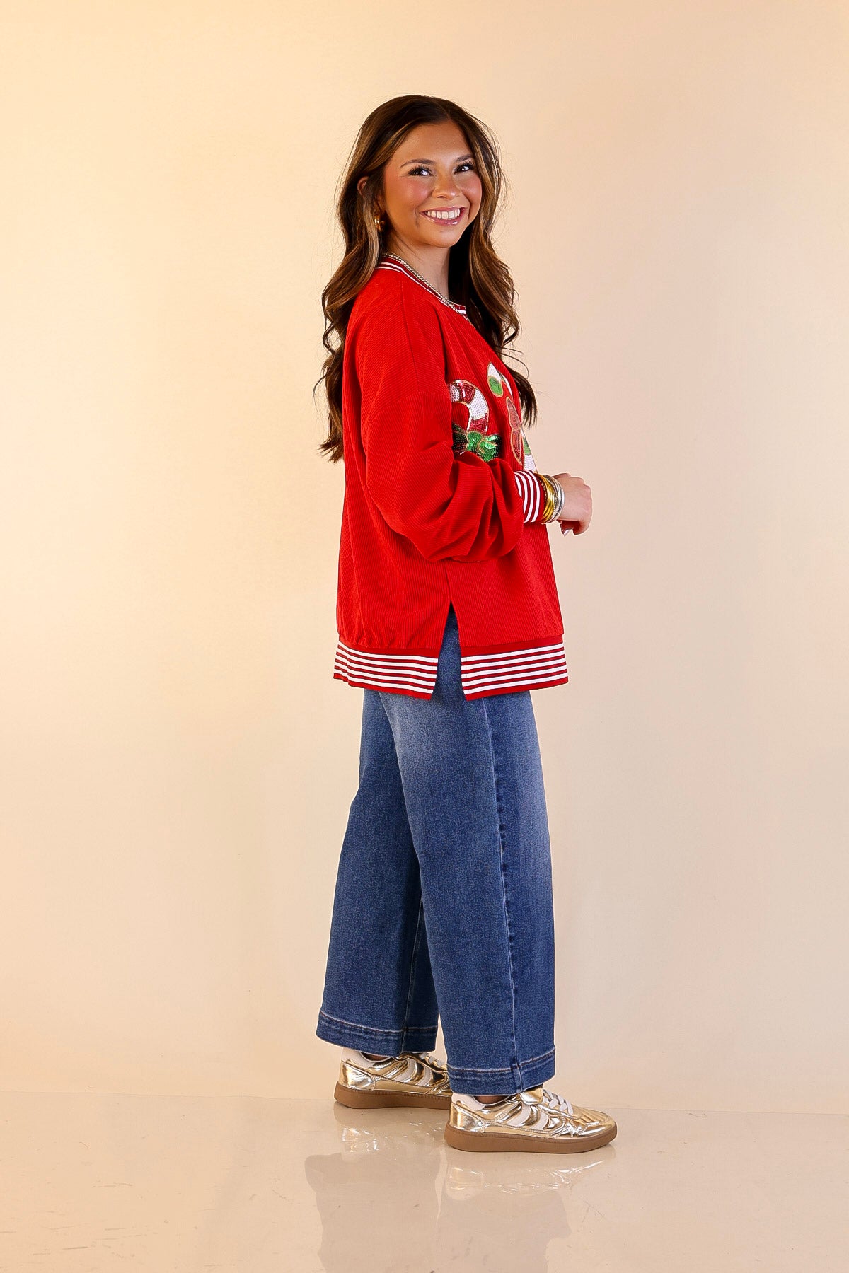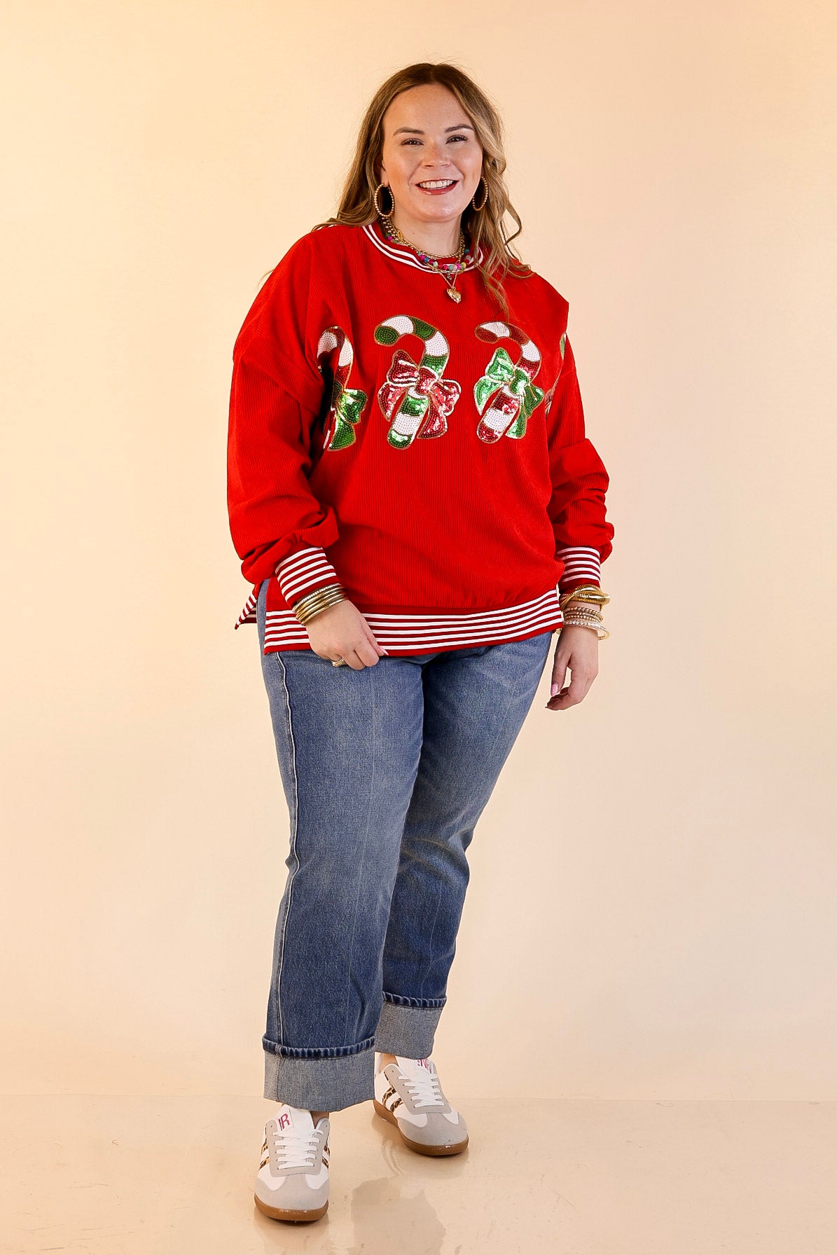 Candy Cane Lane Corduroy Crewneck Top with Side Slits and Sequin Candy Canes with Bows in Red