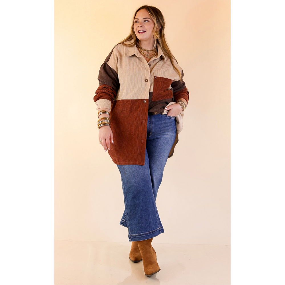 Casual Cuddles Color Block Corduroy Shacket in Brown Mix