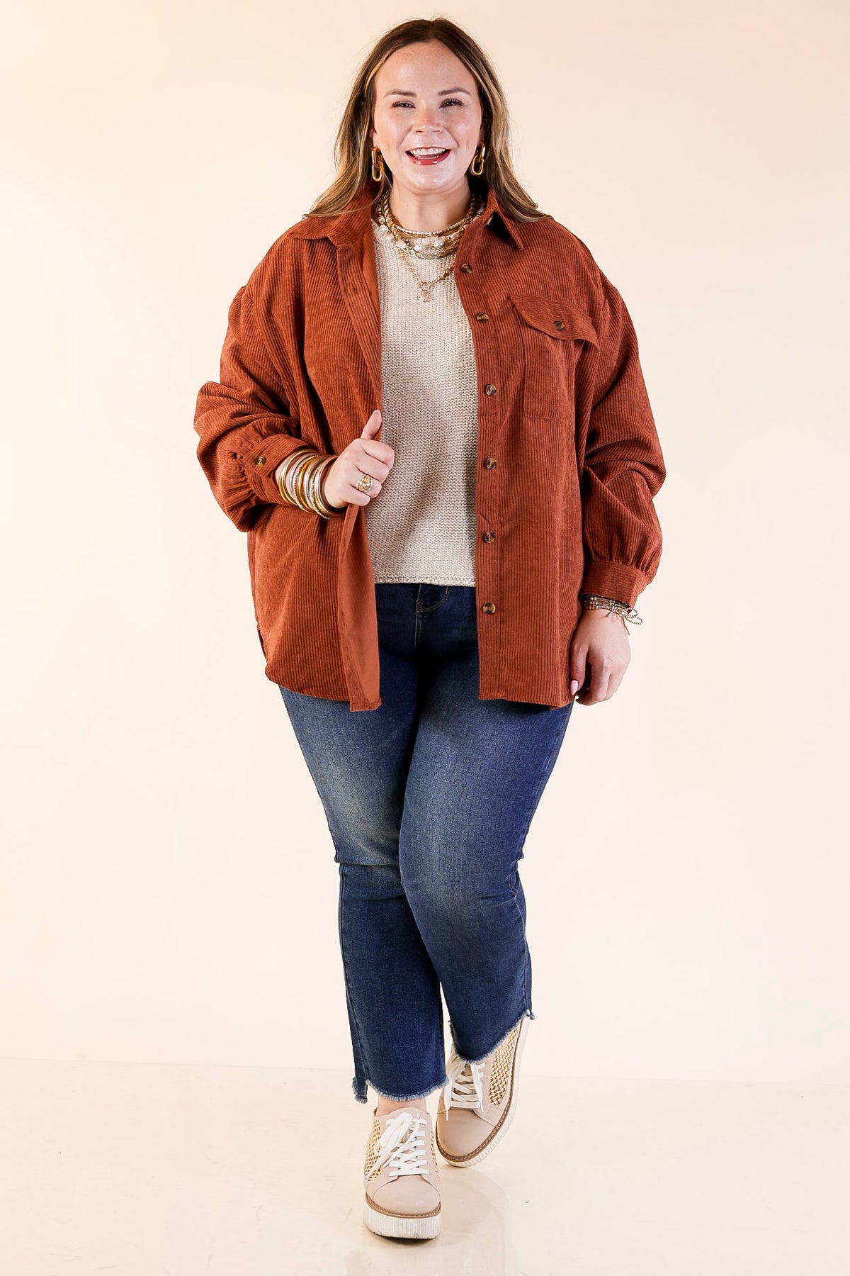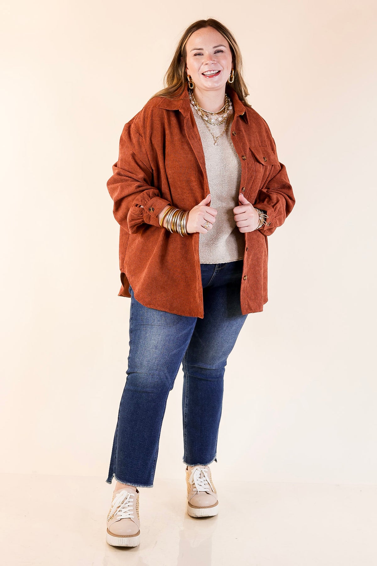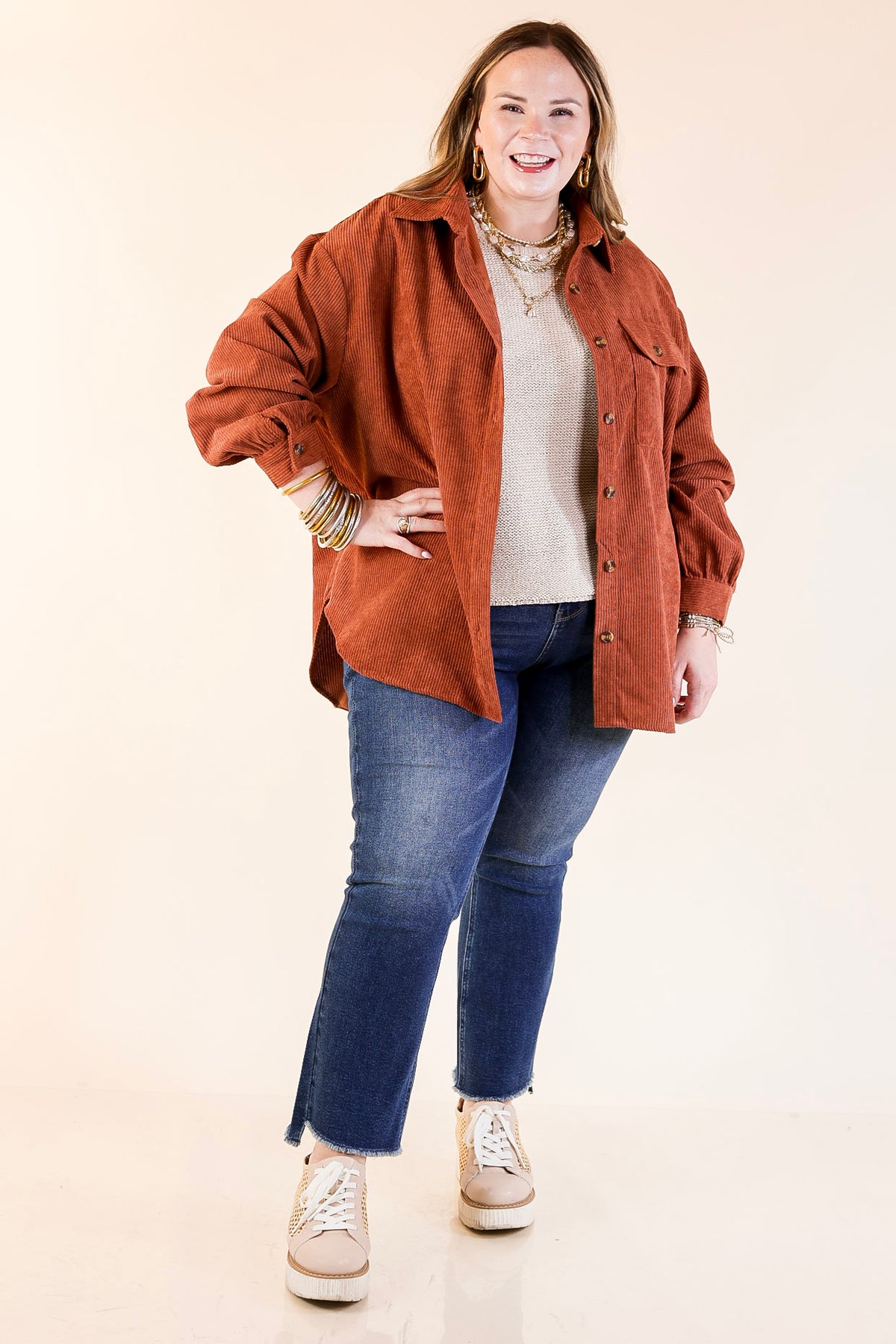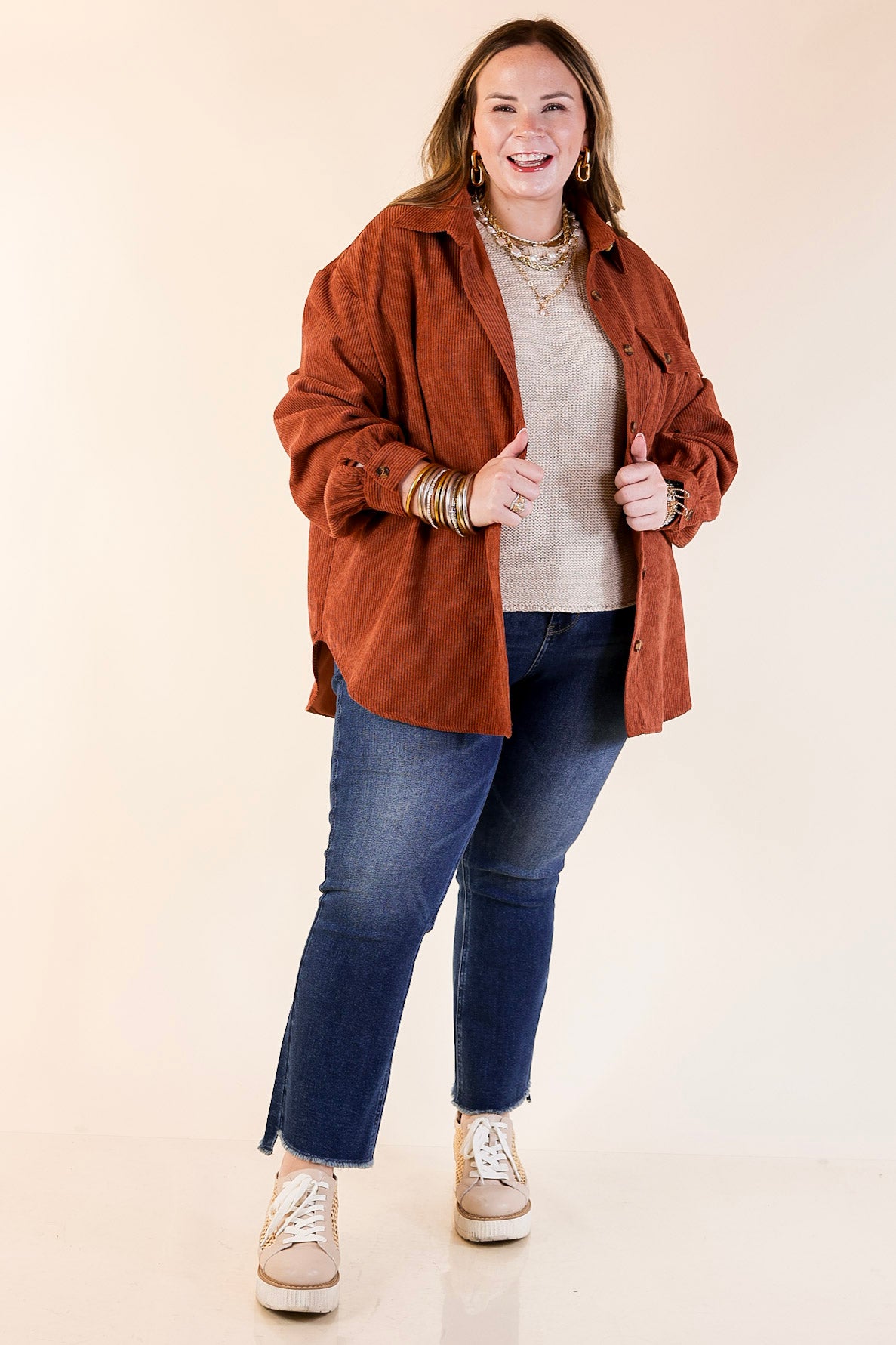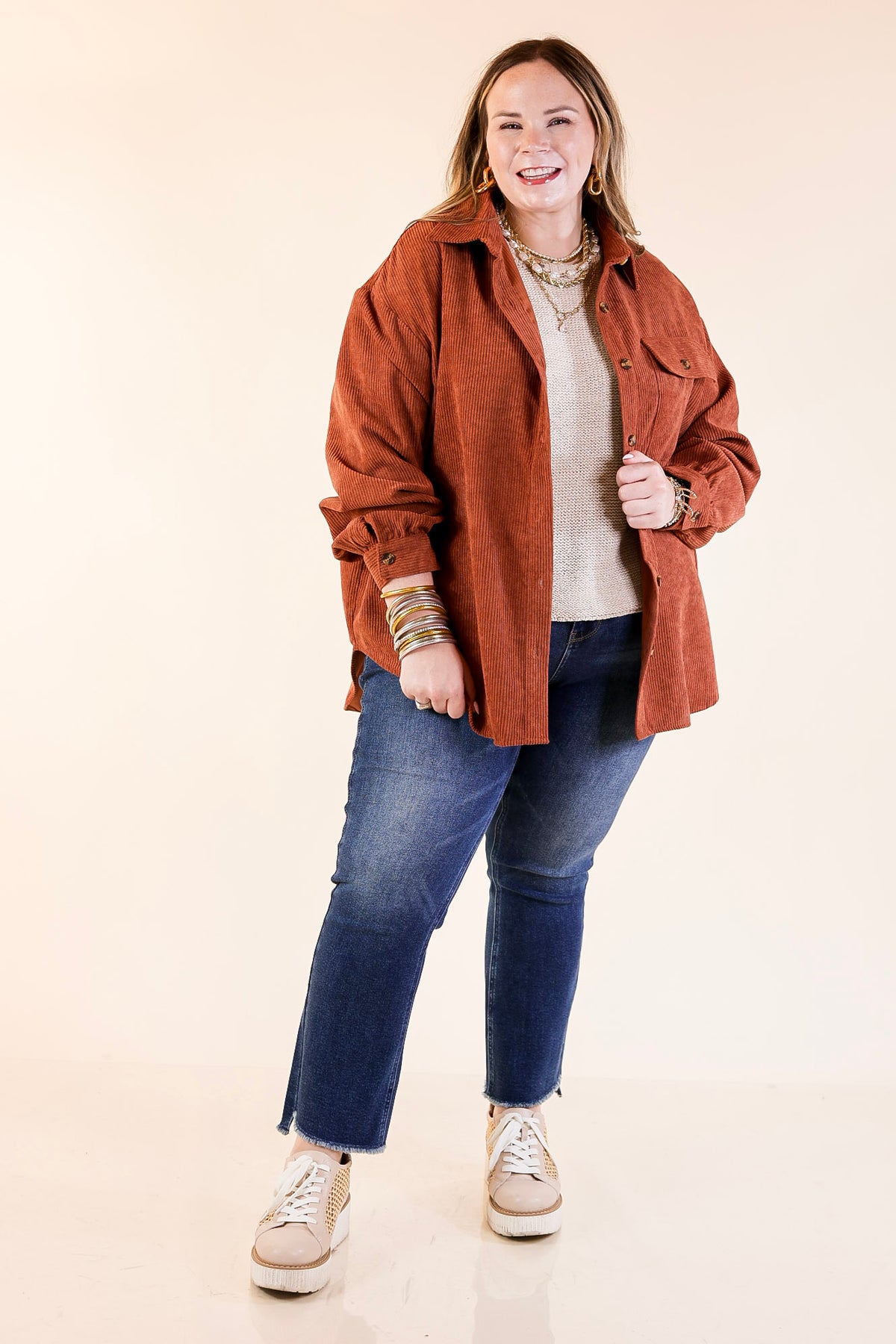 This adorable shacket is giving us all of the best vibes! It includes a button up front, front pockets, a collared neckline, a corduroy body, and so much style! Throw it on over one of our lounge and leisure tops and you'll be set!