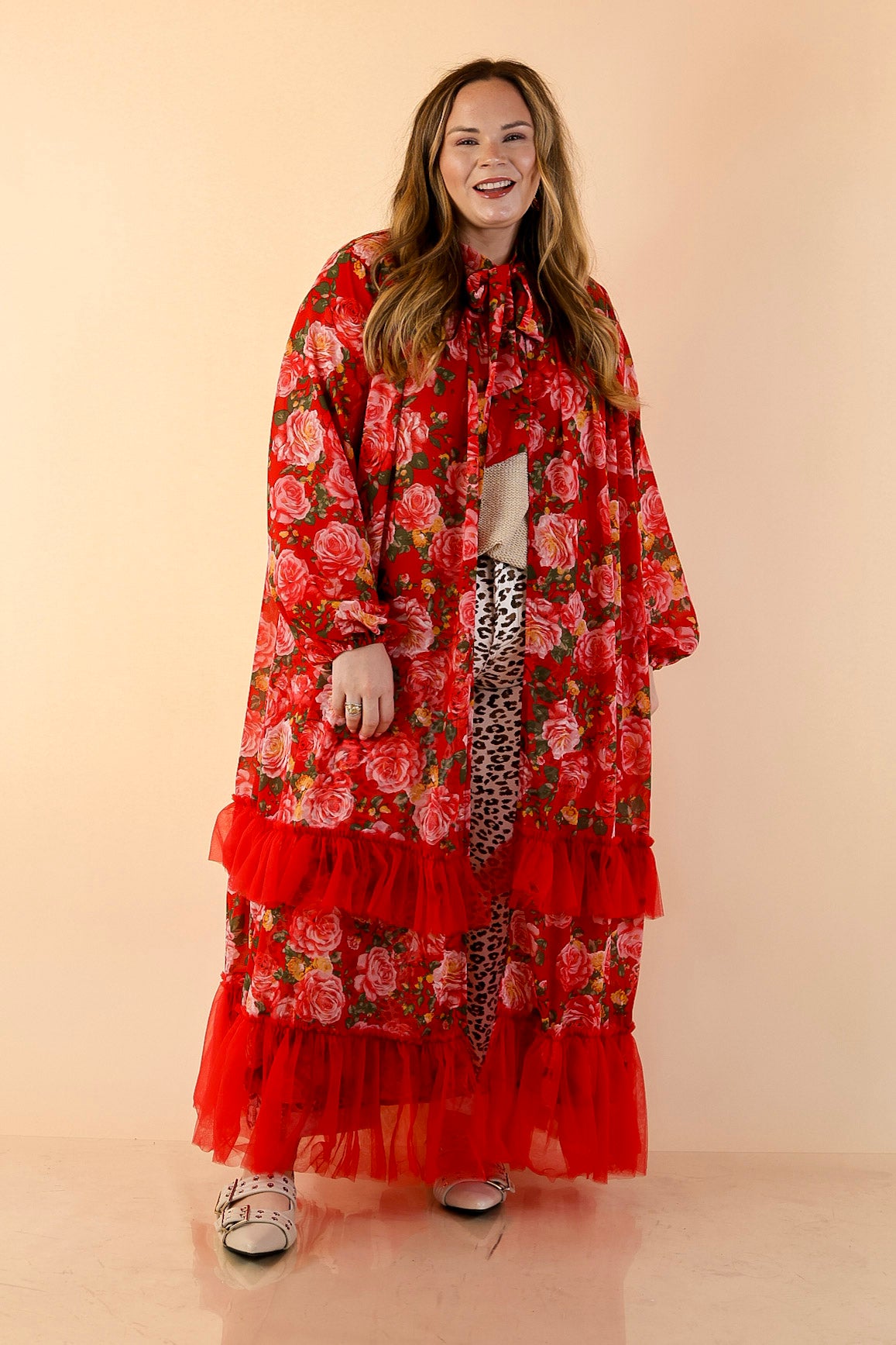 The lightweight fabric drapes beautifully, while the tiered red tulle ruffle trim adds movement and undeniable drama. Wear it open over denim and a fitted top for an elevated everyday look, or tie it at the neck for a more styled, romantic moment.