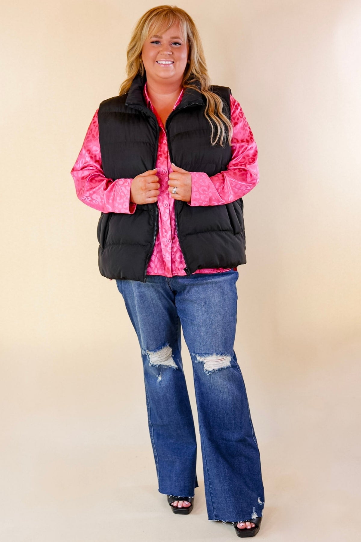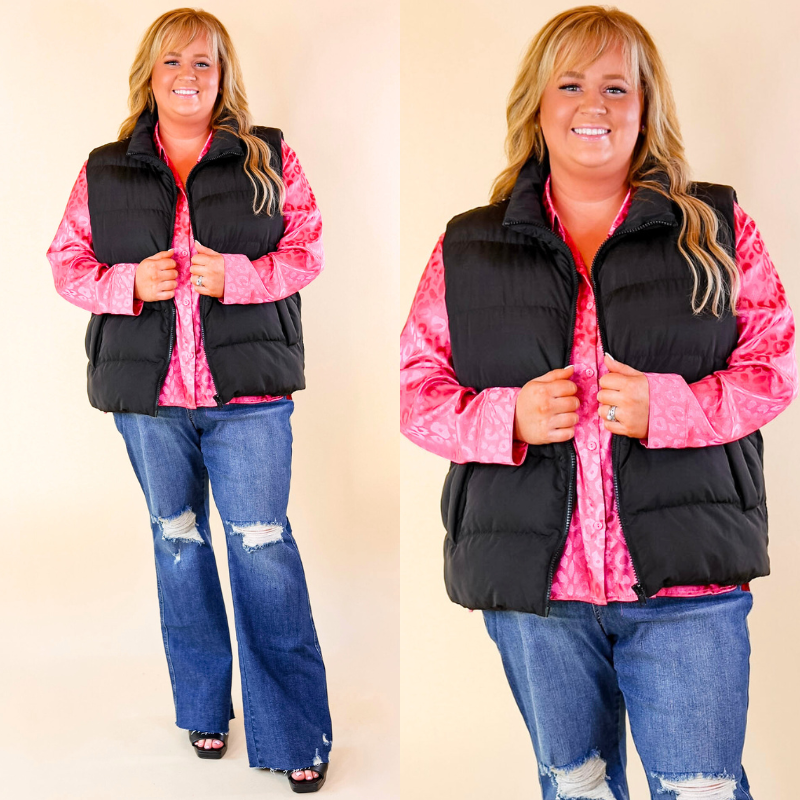 Brave the elements in style with the Whispering Pines Puffer Vest in Black. This eye-catching zip-up vest features black fabric, front pockets, and a high neck for added warmth. Plus, you'll look as stunning as you feel! Enjoy a pop of color and unbeatable comfort in any weather.