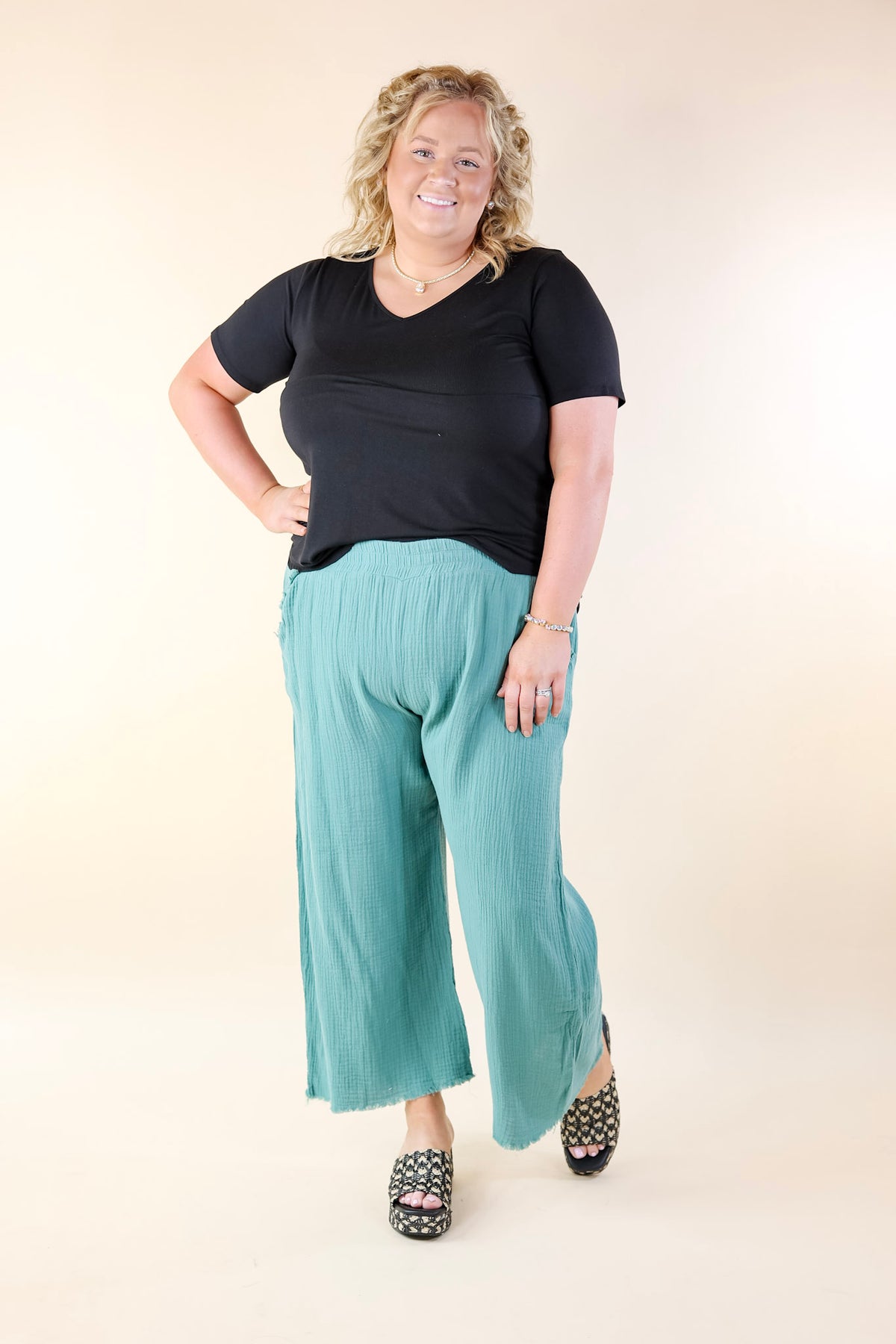 Discover effortless style with our "Right on Cue" pants! Featuring convenient pockets, an elastic waist with a drawstring for the perfect fit, and trendy frayed edges, these pants are versatile and chic. Pair them with a blouse for a polished look or a graphic tee for casual flair. Step into comfort and style with this versatile wardrobe staple!