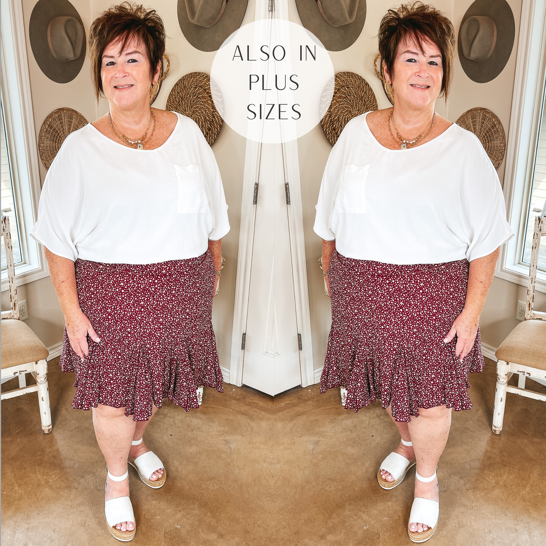 This skirt is giving us the best new views! It includes an elastic waist, a ruffled he, and a small ivory leopard print on a mauve pink background. This is perfect to go with a graphic tee and denim jacket! Abby is wearing a size large. Nancy is wearing a size 2XL.