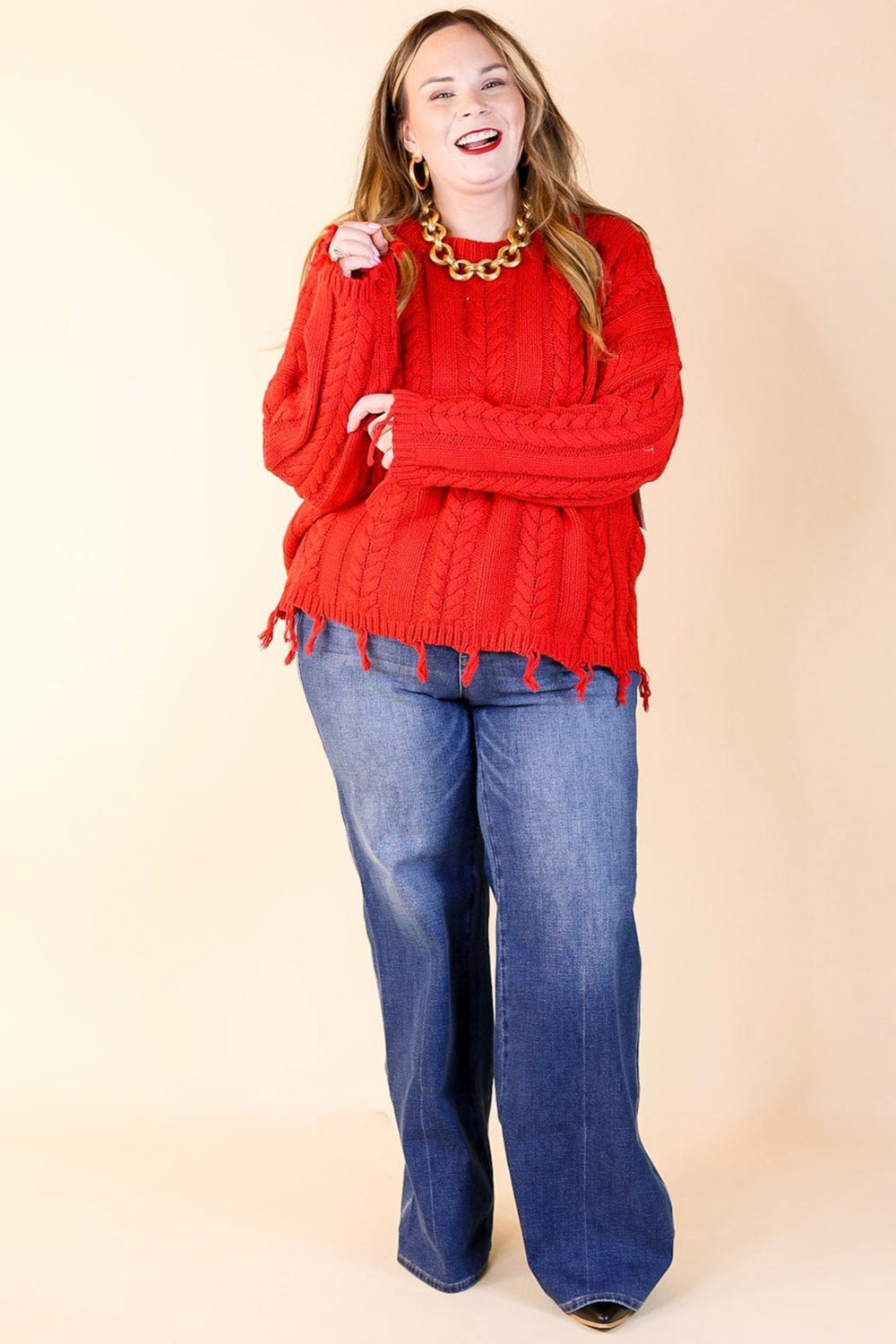 Ready Willing and Cable Knit Pullover Sweater with Frayed Hem in Red