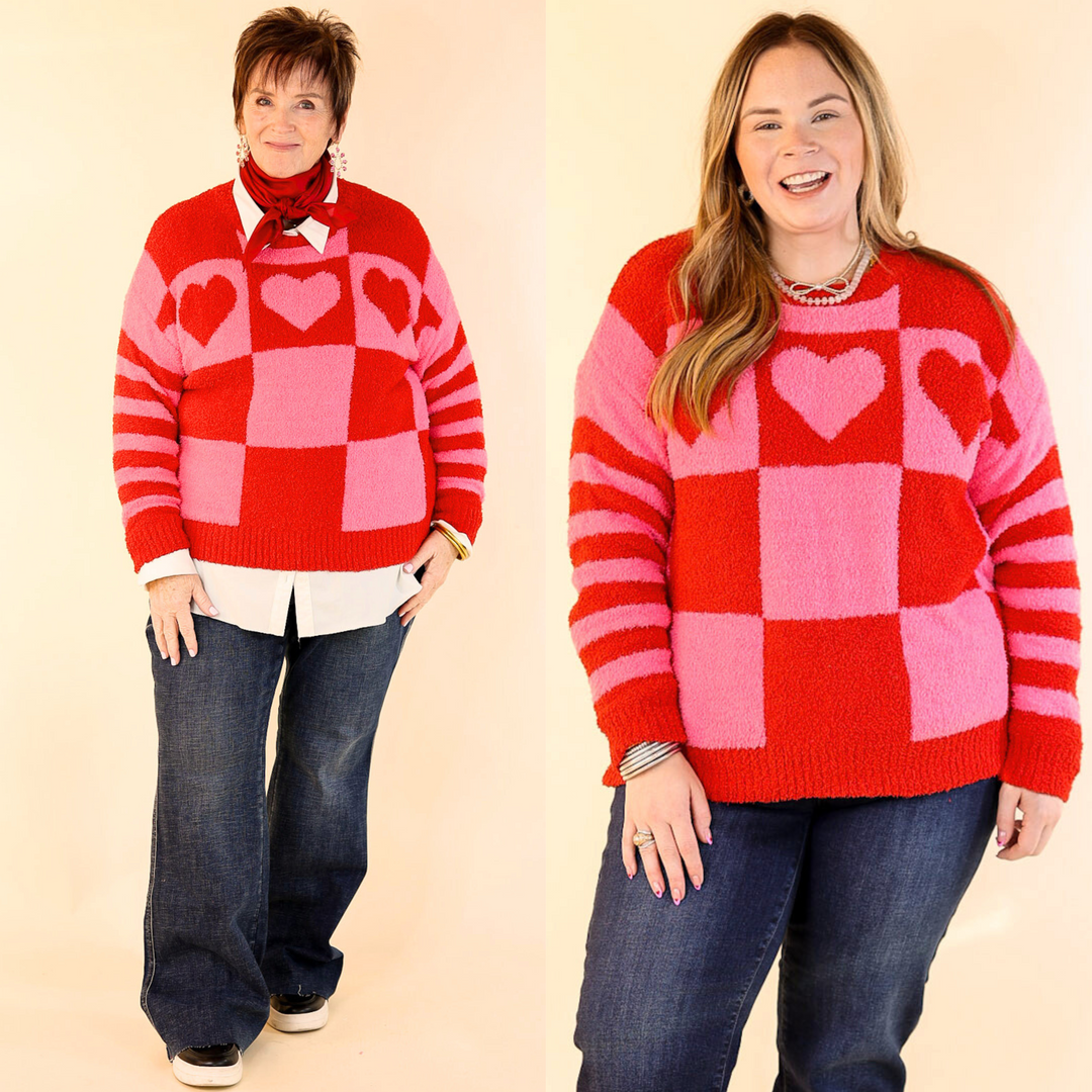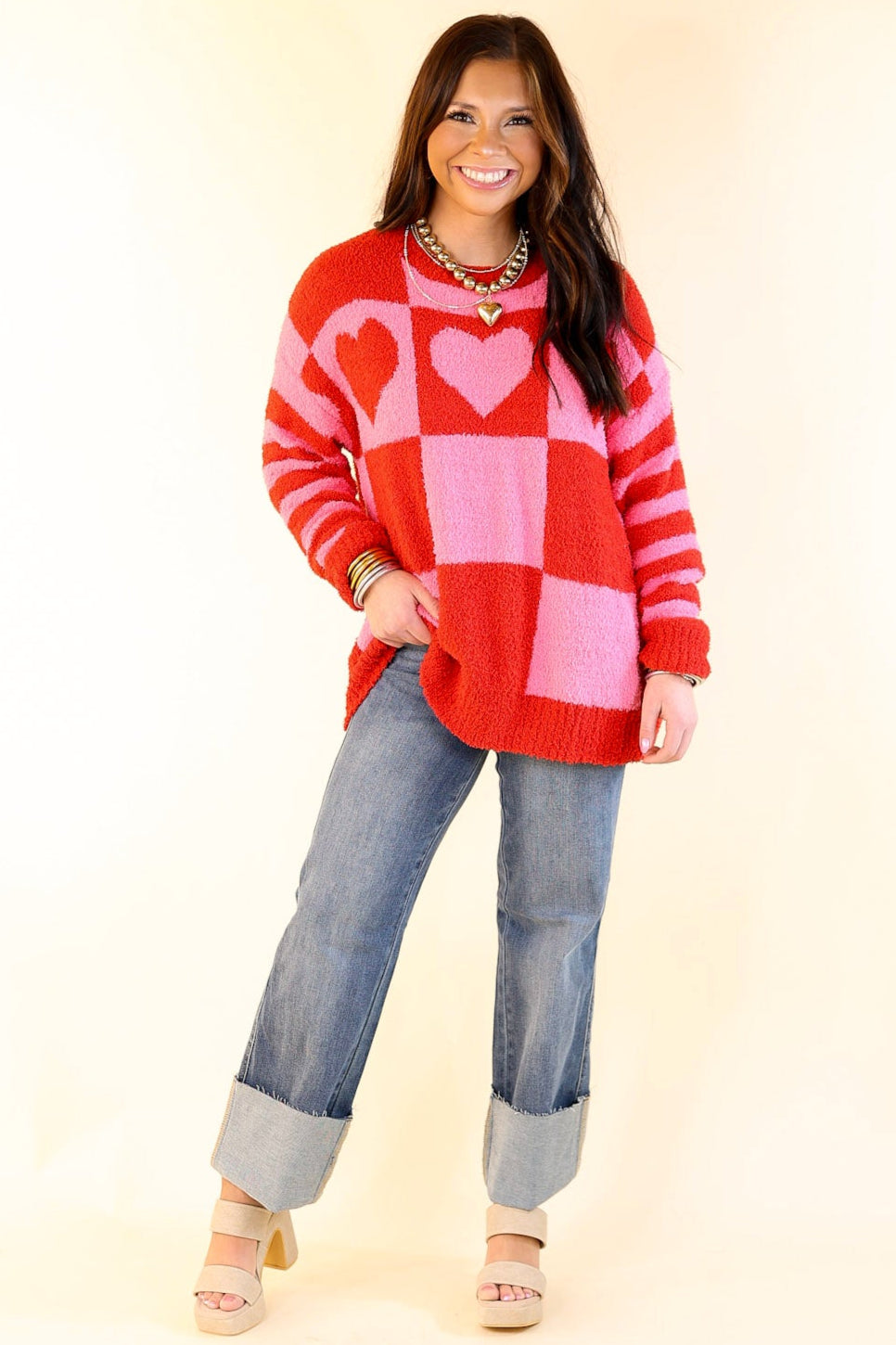 Heart on My Sleeve Checkered Sweater with Hearts in Red and Pink