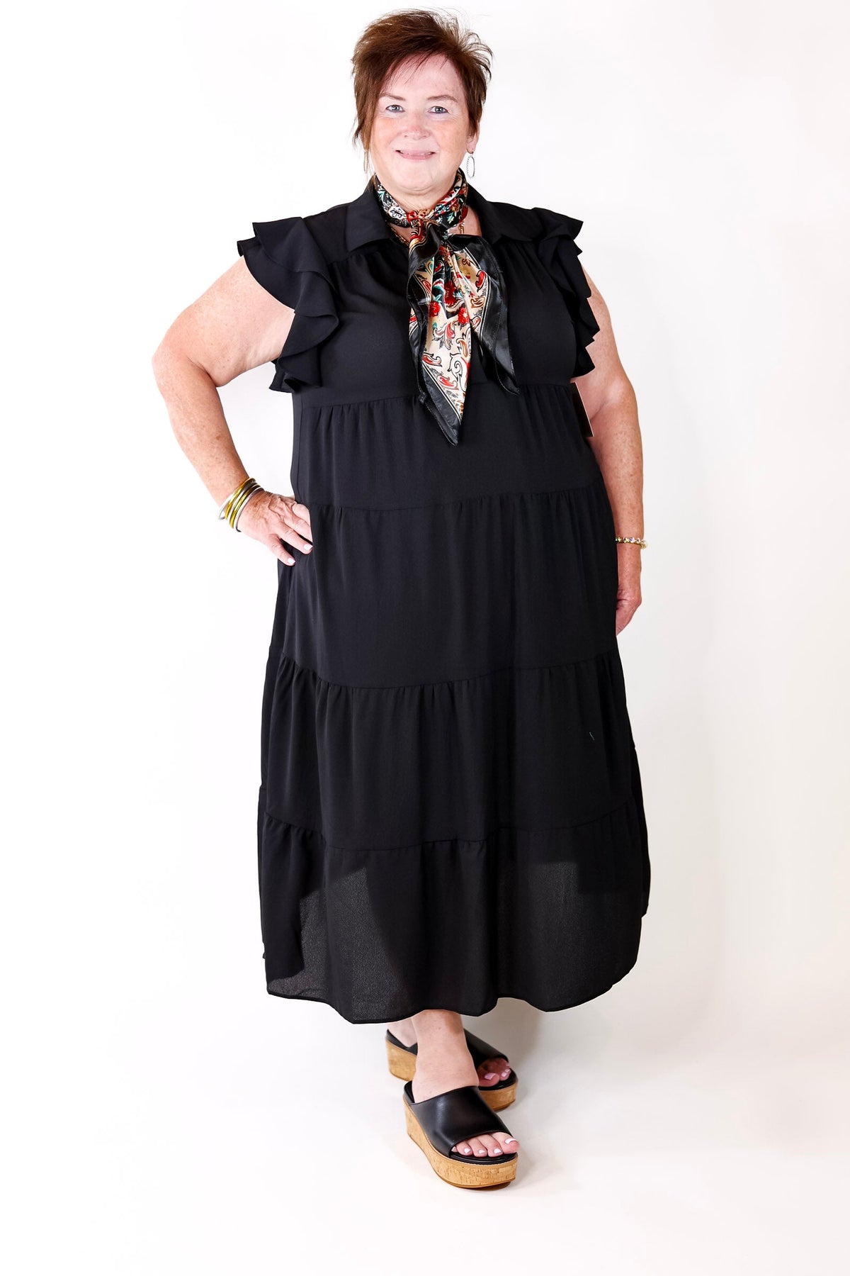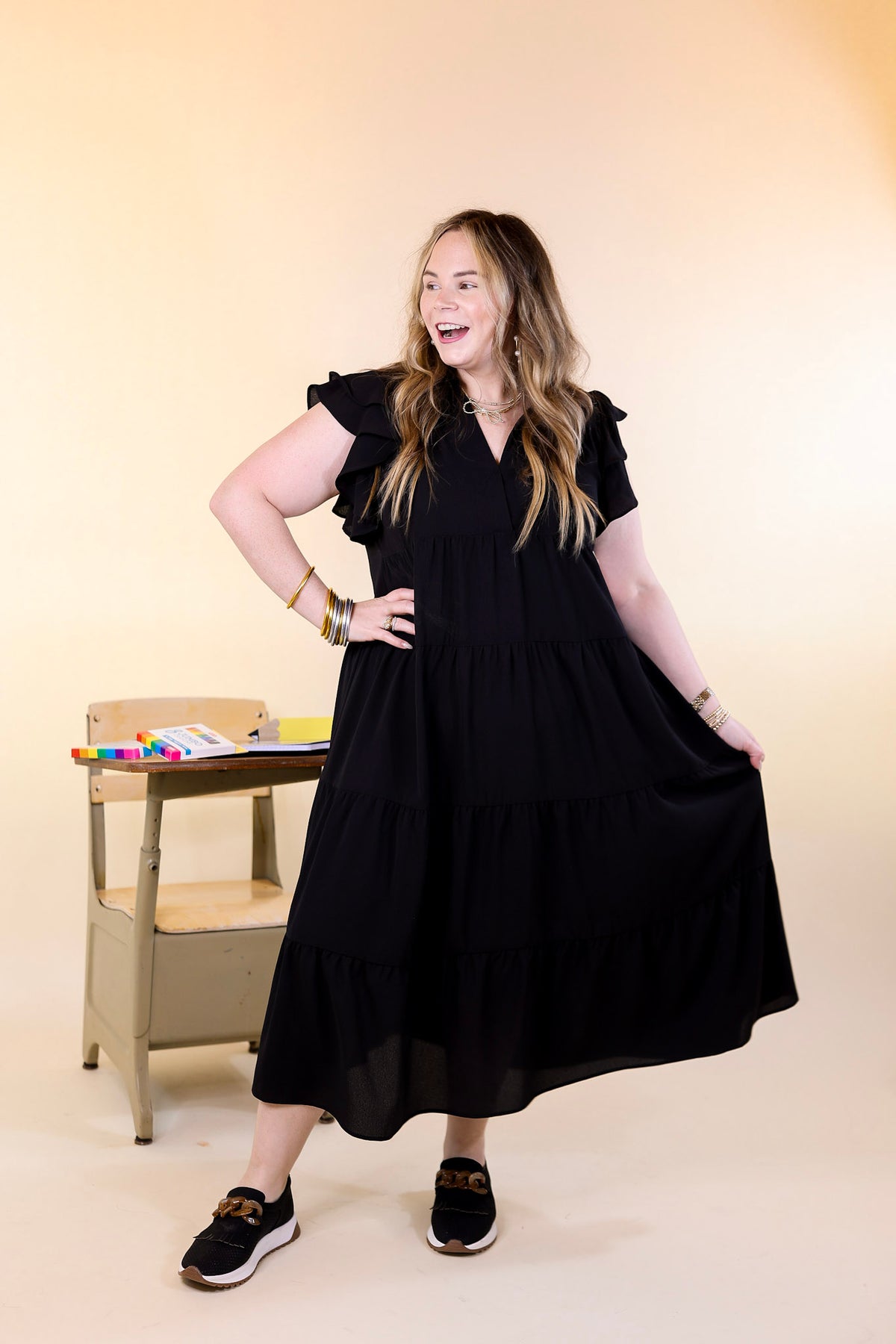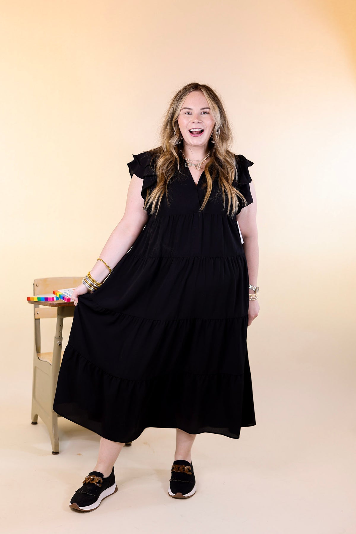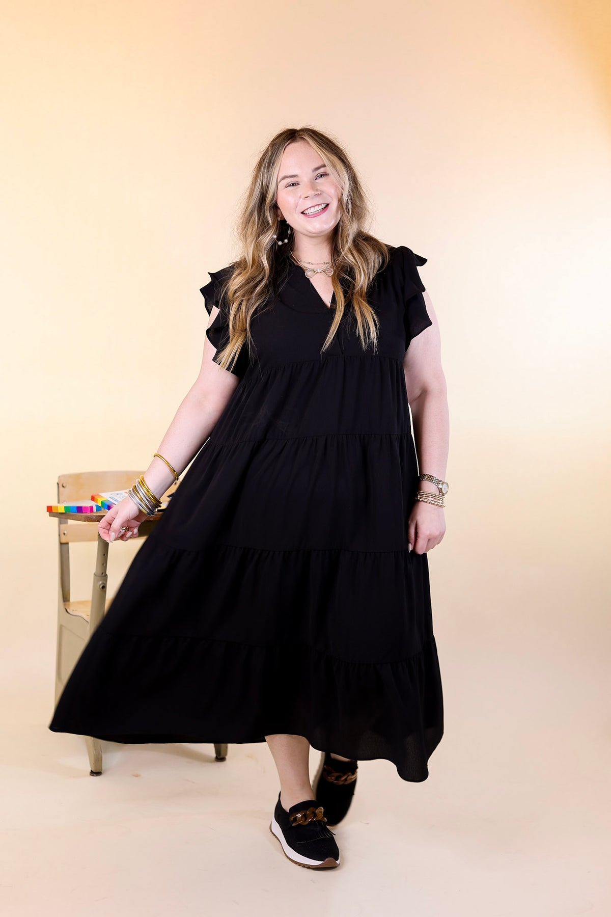 All Of A Sudden Tiered Midi Dress with Ruffle Cap Sleeves in Black