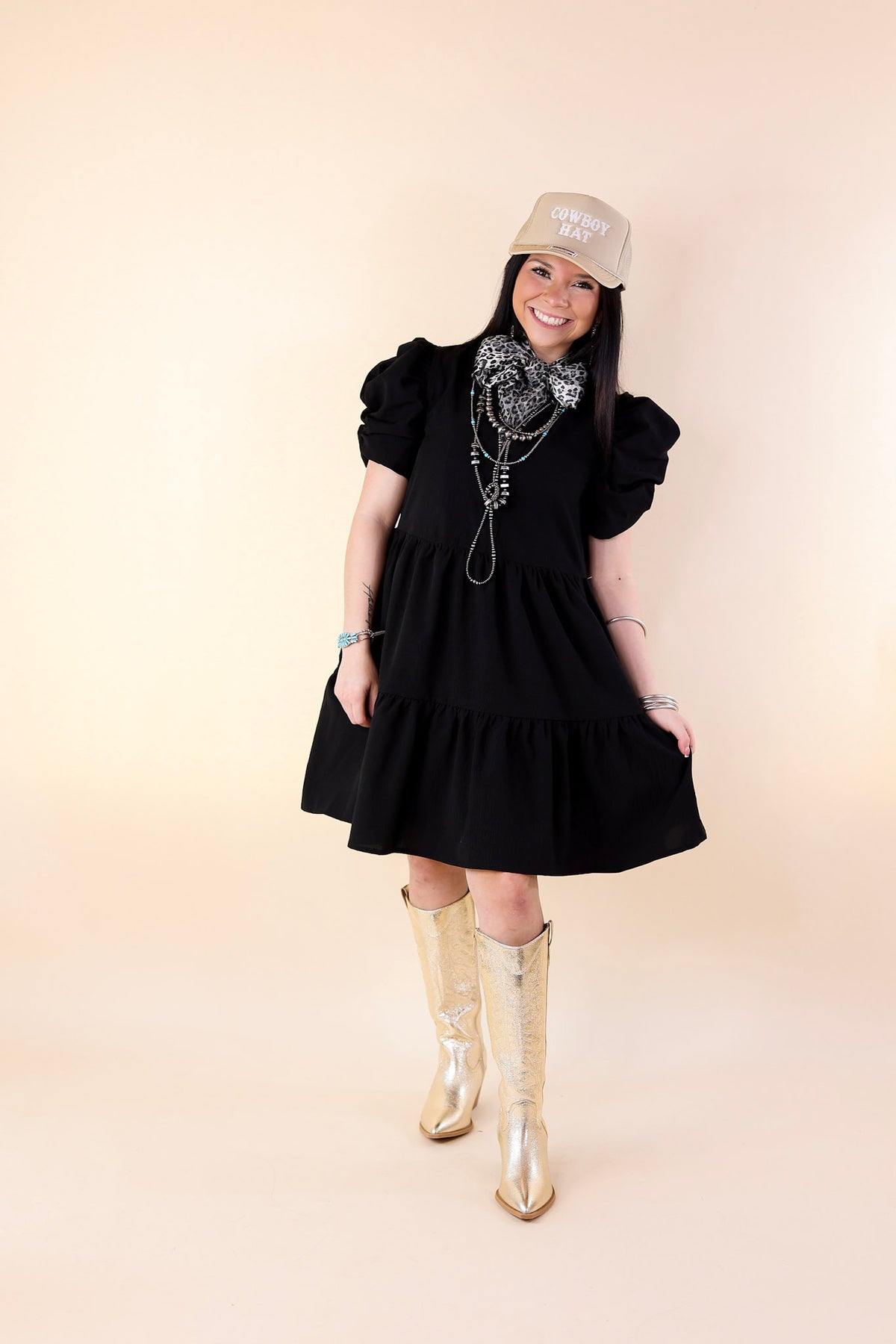 This Call Me Chic Balloon Sleeve Short Dress will bring new life to casual days. Crafted from lightweight fabric with effortlessly chic balloon sleeves and a tiered body, it’s sure to flatter any figure. V-neckline adds a stylish touch while the black shade ensures an effortless look. Elevate your style with ease! Available in small to 2XL.