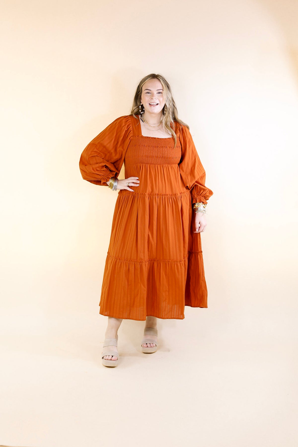 Sunshine And Cider Long Sleeve Tiered Midi Dress in Rust Orange