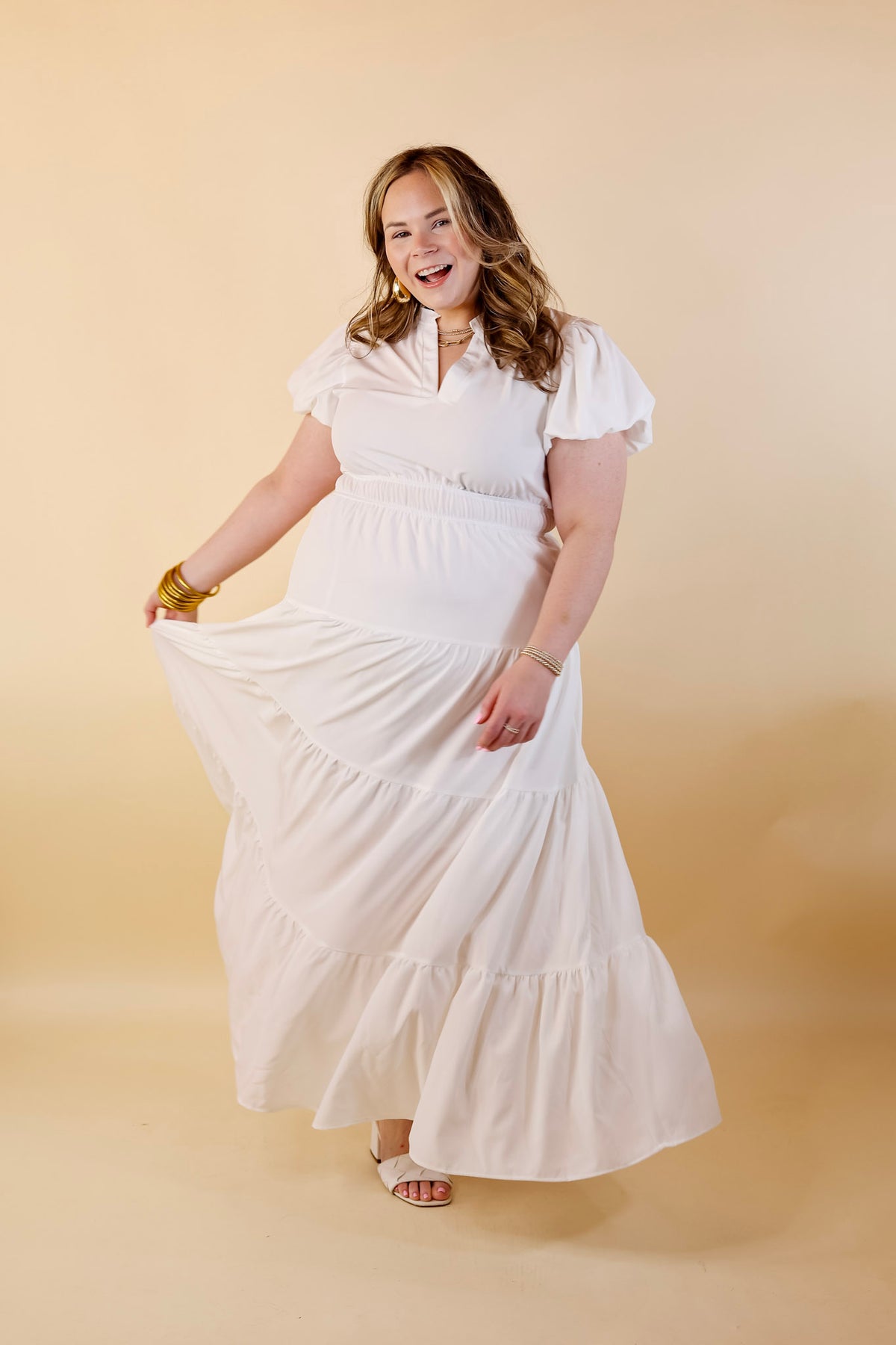 Table for Two Tiered Maxi Dress with Puff Sleeves in White