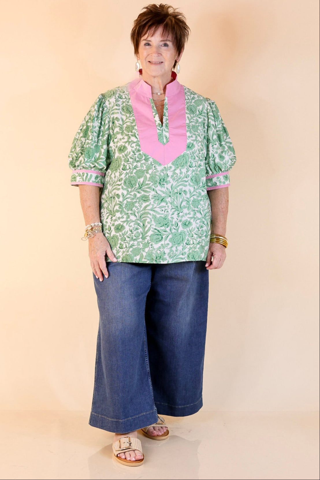 Soft, feminine, and made to stand out—the Blush and Bloom top is your go-to pick for effortless spring style. This eye-catching top features a green floral print with subtle blush pink accents on the sleeves, collar, and neckline for a perfectly balanced look. The notched neckline and short puff sleeves add a flattering, feminine touch that pairs beautifully with jeans, white pants, or a skirt.