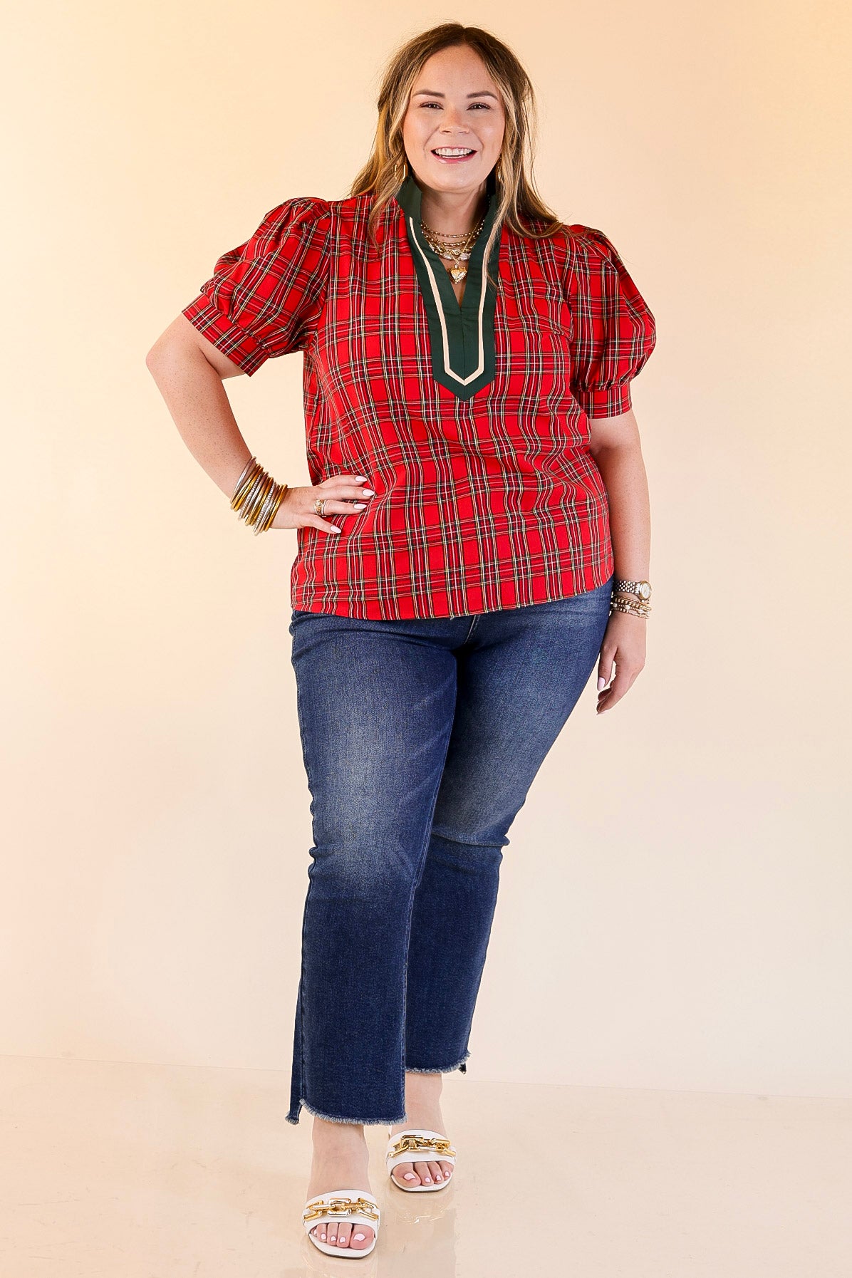 Make a Chic Statement with this bold plaid top that’s made for turning heads. Designed with short puff sleeves, a v neckline, and contrast trim in green and cream, it strikes the perfect balance between festive charm and polished style.