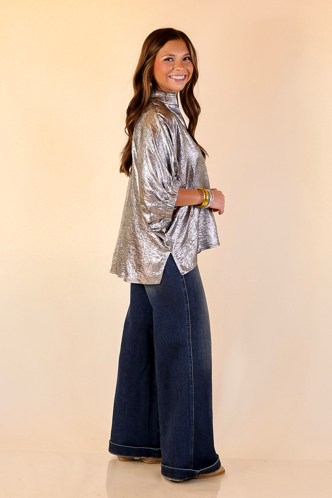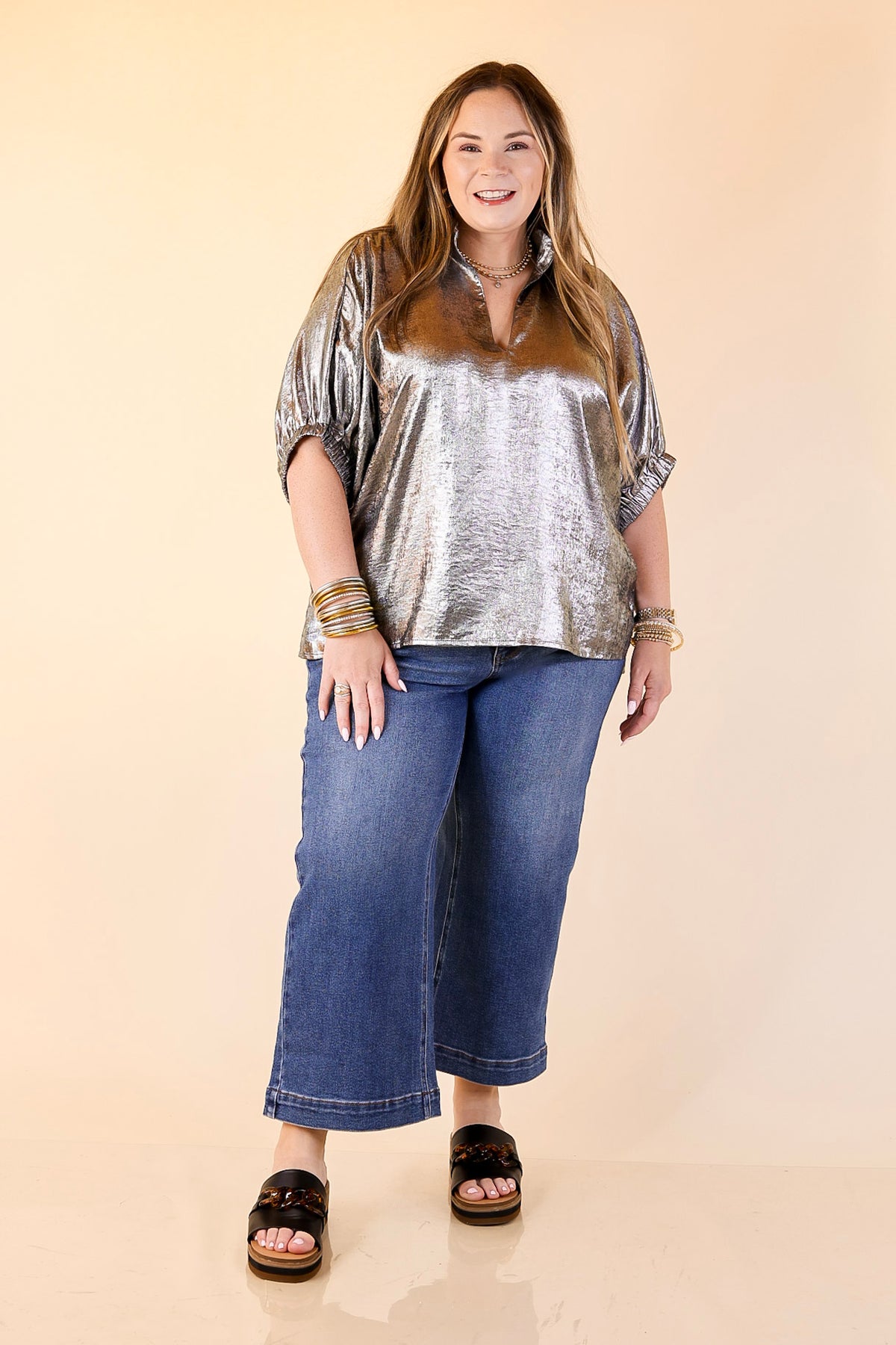 The Naturally Stylish Shiny Metallic Short Puff Sleeve Top in Silver is your statement-maker with the same fit you already love. This bestselling body features a flattering V-neckline, short puff sleeves with subtle elastic, and a relaxed silhouette that’s easy to dress up or down. The metallic silver finish takes it to the next level, making it perfect for holiday parties, date nights, or adding a little glam to your everyday look. Pair it with denim for casual sparkle or sleek pants for a night-out vibe.