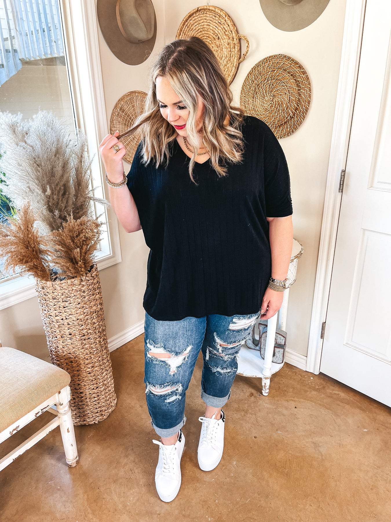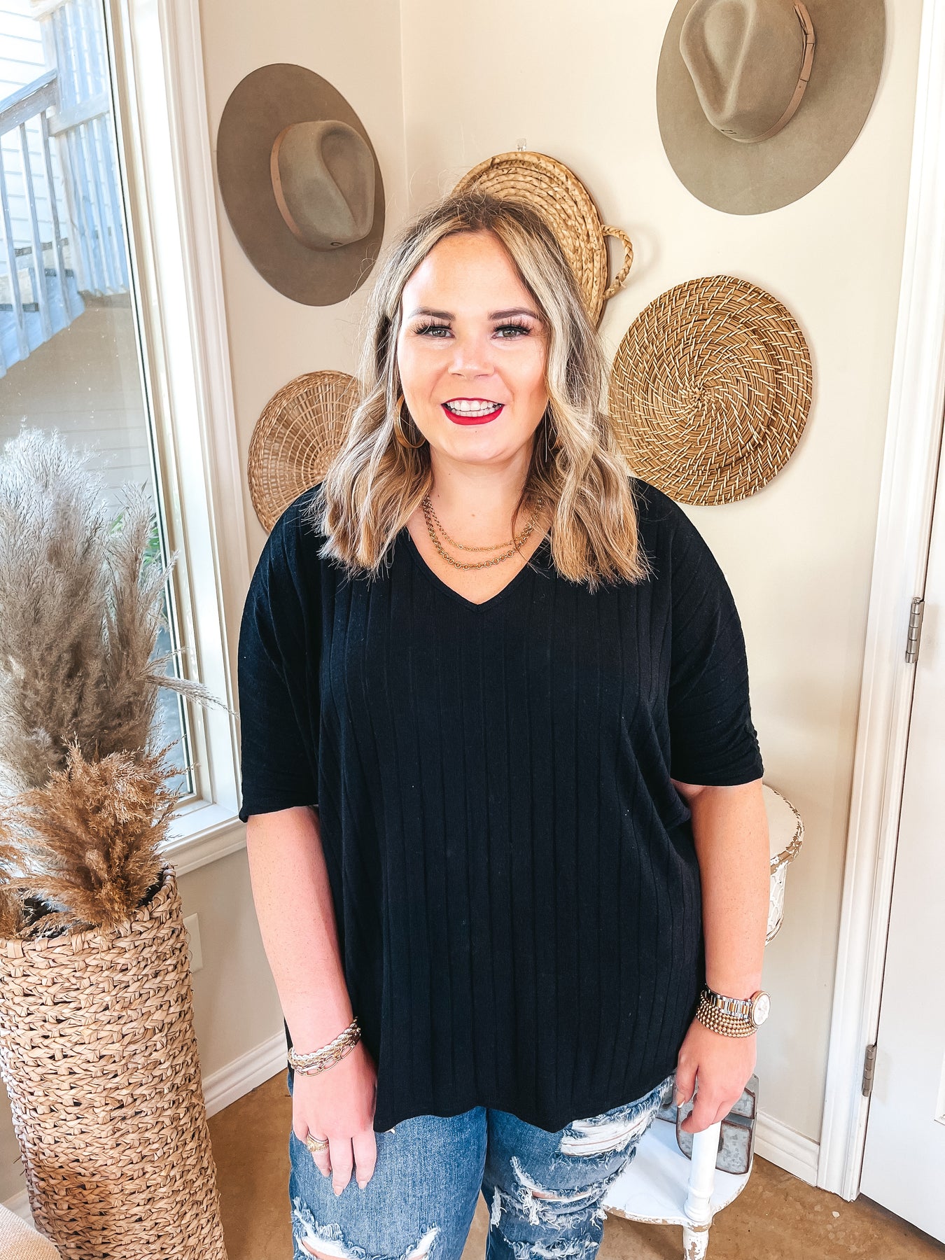 There's no secret, this is my new favorite basic top! This is the perfect piece for dressing up or dressing down! It includes a v neckline, half sleeves, a ribbed material, and a poncho style body. Pair these with booties and skinnies for a going out look, or throw on with sneakers and leggings to stay cozy! Lily is wearing a small. Abby is wearing a large.