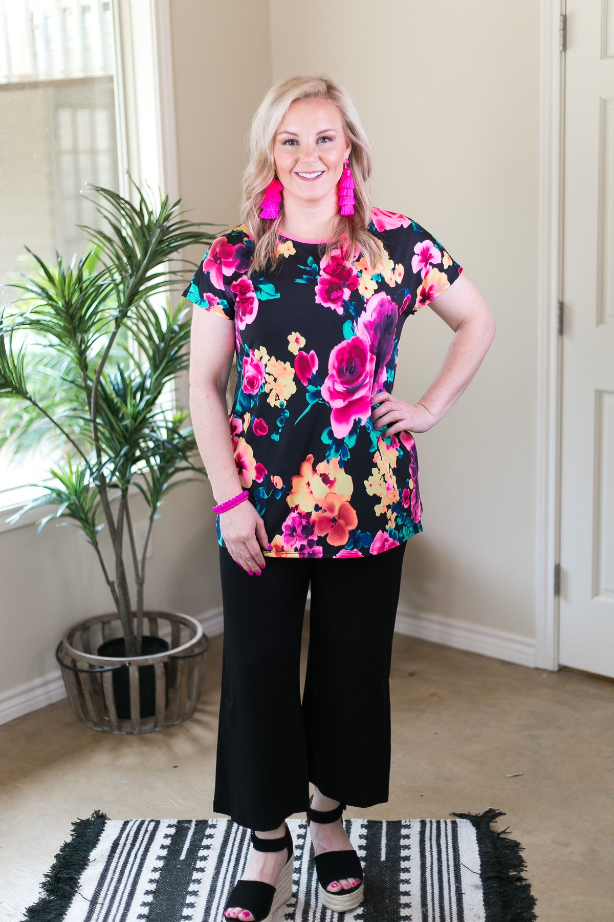 Just when you thing this a just a plain ol' shirt, just wait until you catch the backside! This trendy top features colorful neon floral print body with leopard print trim and an open back. The pretty floral print fabric features colors of black, neon pink, yellow, green, blue and more. Dropped shoulders with short sleeves, this top is perfect for any occasion! Perfect to wear with a criss cross camisole or even a lace bralette. Emery & Mallory is wearing size small. Nancy is wearing size 2XL.