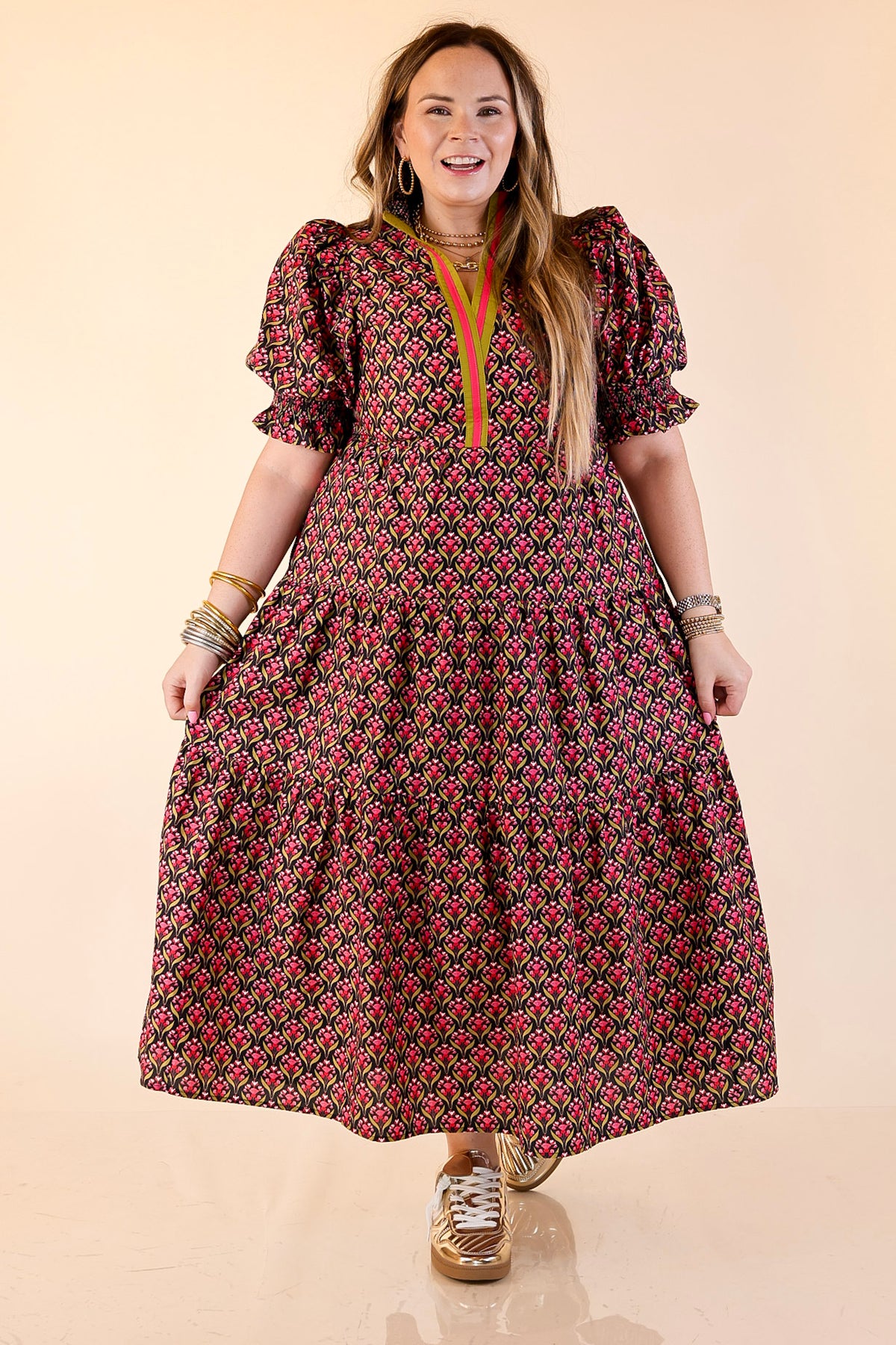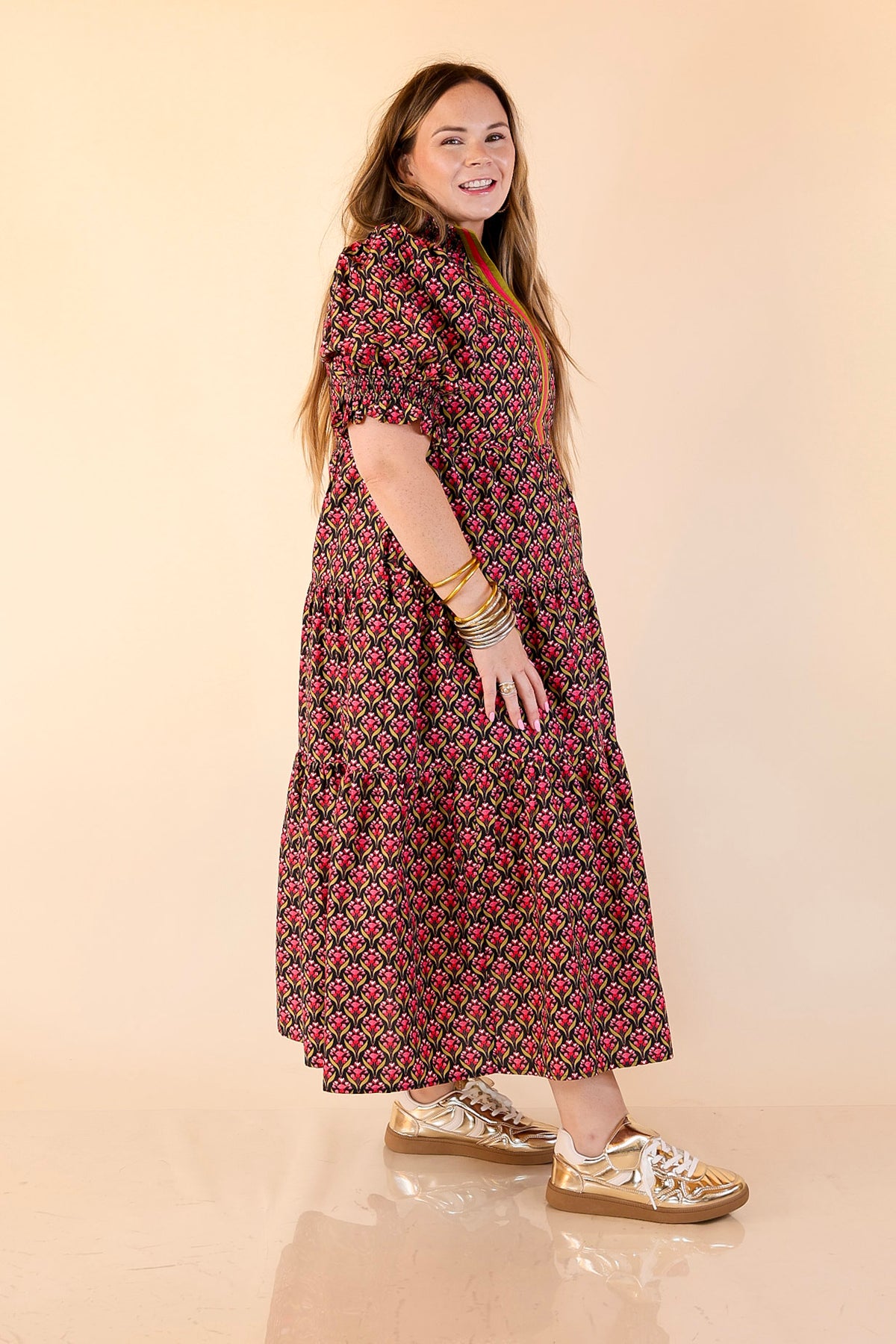 Vibrant Vision Floral Print Maxi Dress with Puff Sleeves and Contrast Trim in Black