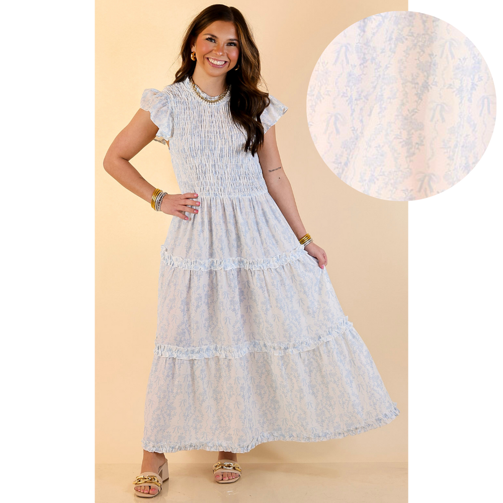 Mud Pie | Graceful Charm Smocked Toile Print Tiered Midi Dress with Ruffle Sleeves in Blue and White