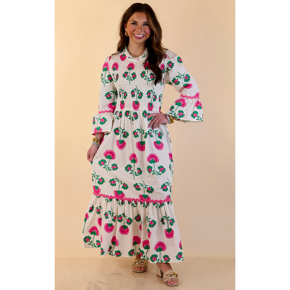 Mud Pie | Petal Parade Smocked Floral Print Tiered Midi Dress with Scallop Trim in Cream Multi
