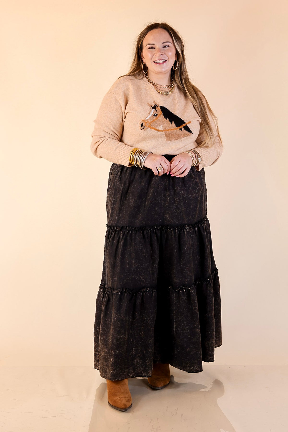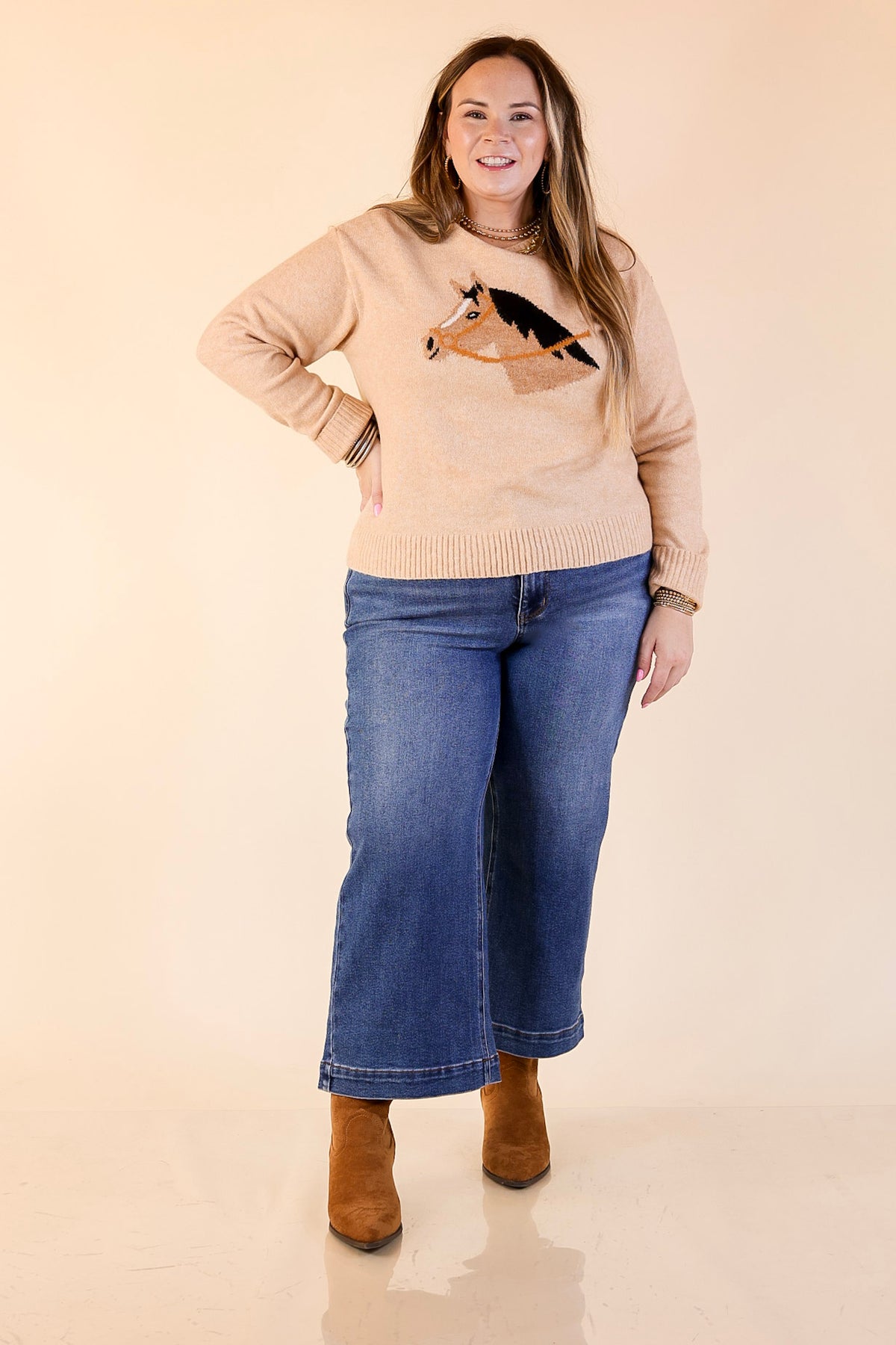 The Finest Touch Soft Knit Sweater with Horse Graphic in Camel brings timeless charm with a touch of luxury. Crafted from an ultra-soft knit fabric, this relaxed-fit sweater features a beautifully detailed horse motif that adds a subtle equestrian-inspired flair. Designed with ribbed trim and a polished silhouette, it blends cozy comfort with elevated everyday style. Perfect for pairing with denim, trousers, or layered over a collared shirt — this is effortless sophistication made wearable.