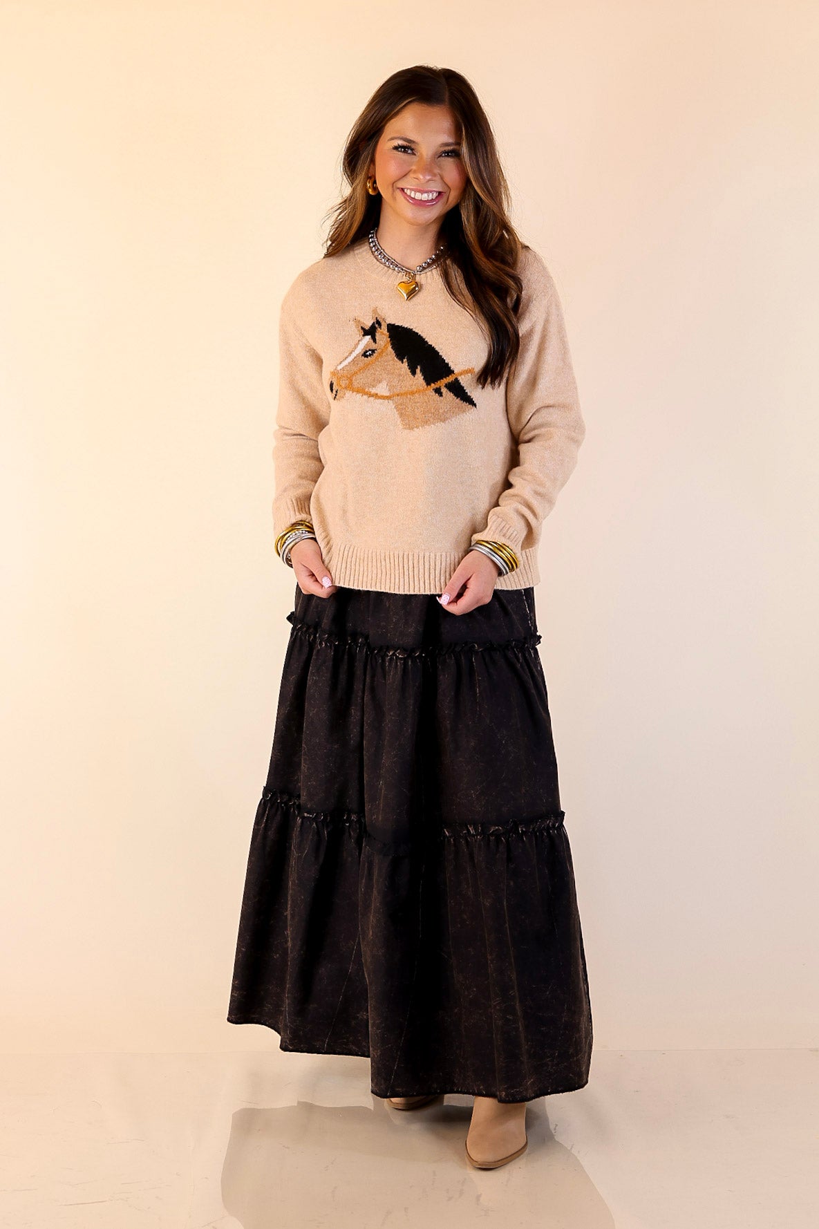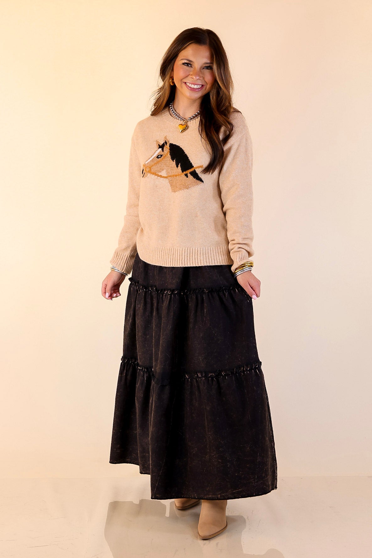 Soft camel knit with woven horse graphic design
