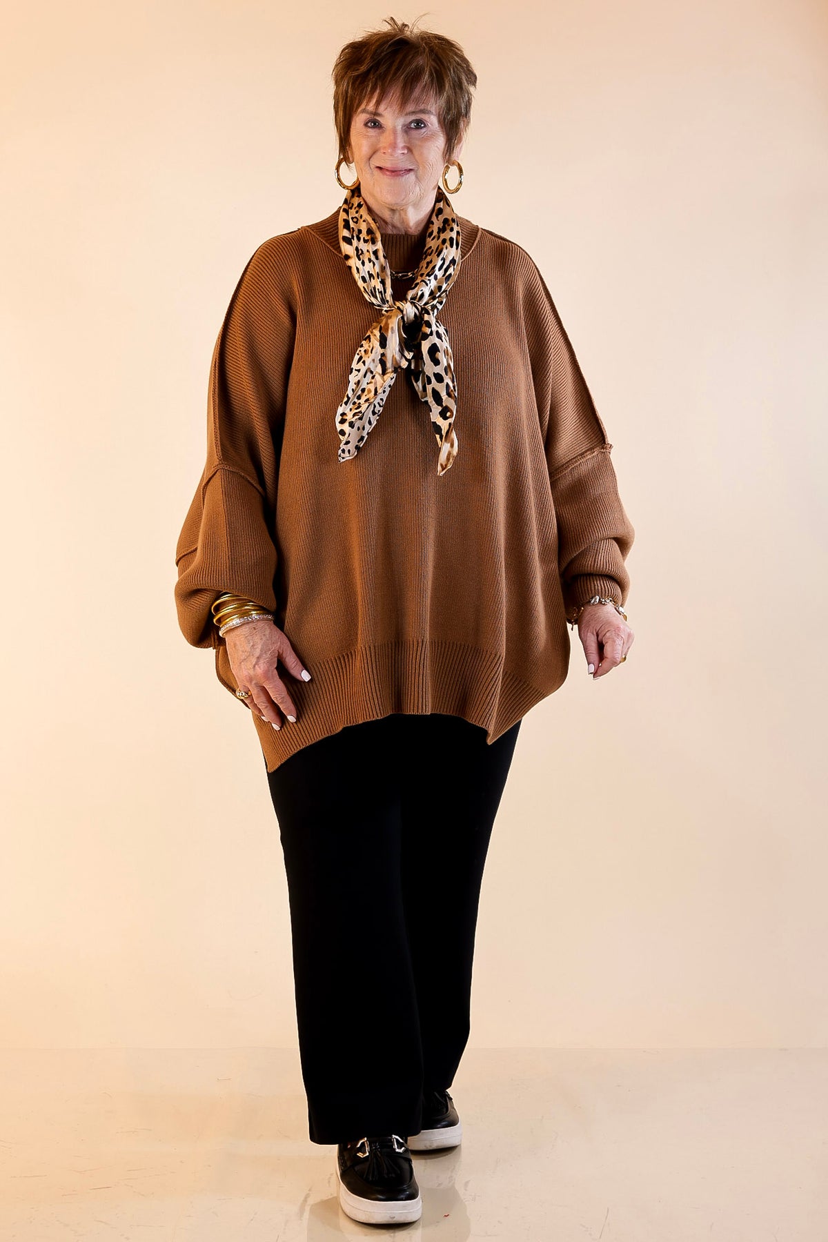 Snug and Stylish Mock Neck Sweater with Side Slit in Camel Brown
