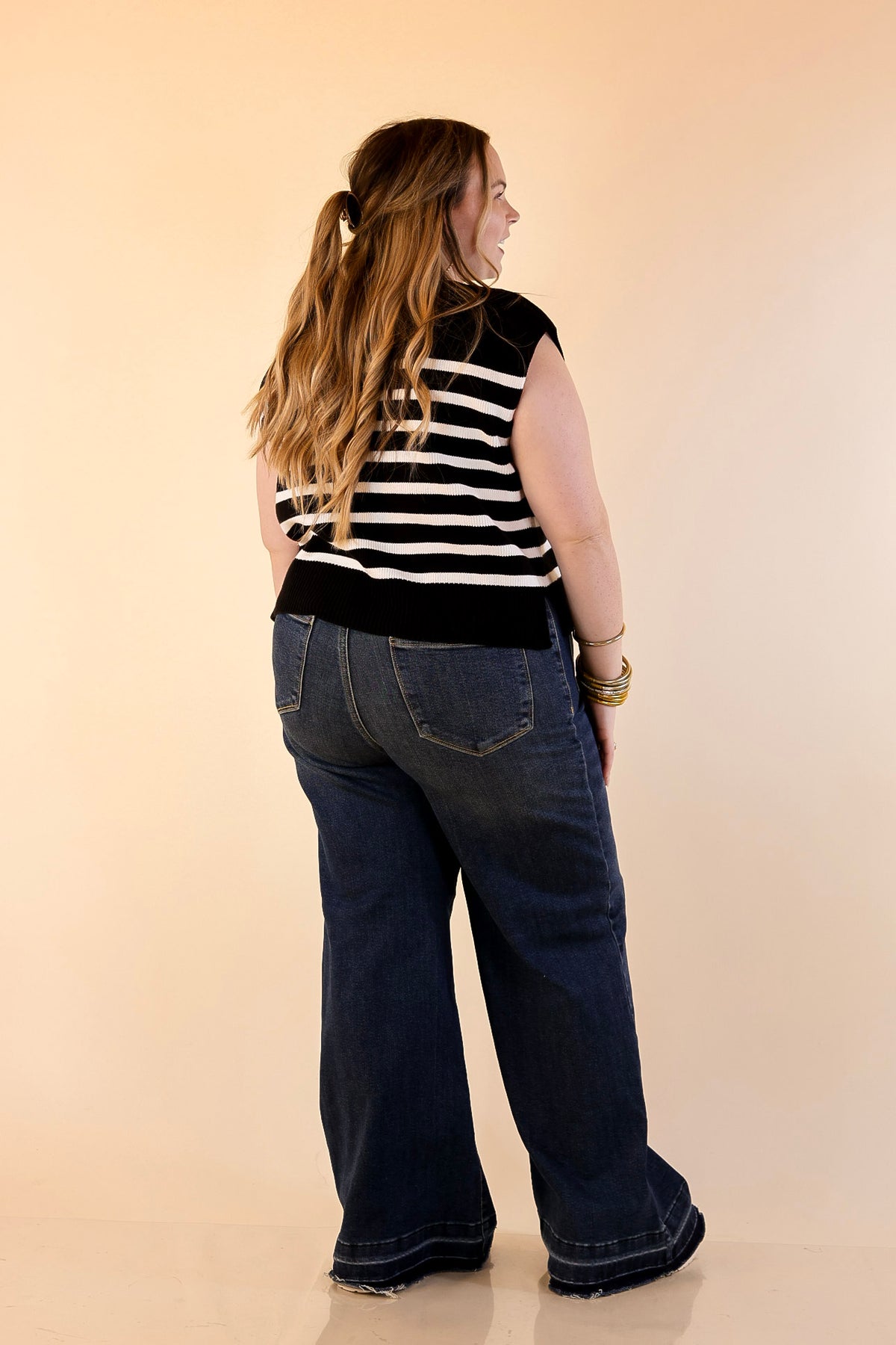 Turn heads without even trying in the Stripe Things Up Drop Shoulder Knit Sweater in White—your go-to for crisp, elevated casual style. This lightweight knit features a soft white base with bold black horizontal stripes, a classic crew neckline, and a relaxed drop shoulder silhouette that makes getting dressed effortless. Subtle side slits add extra comfort and movement, perfect for front-tucking or letting it drape. The oversized fit is designed to flatter a variety of body shapes and sizes, making this piece a versatile must-have. Pair it with black denim, layer it for fall, or style it simple for your everyday go-to look.
