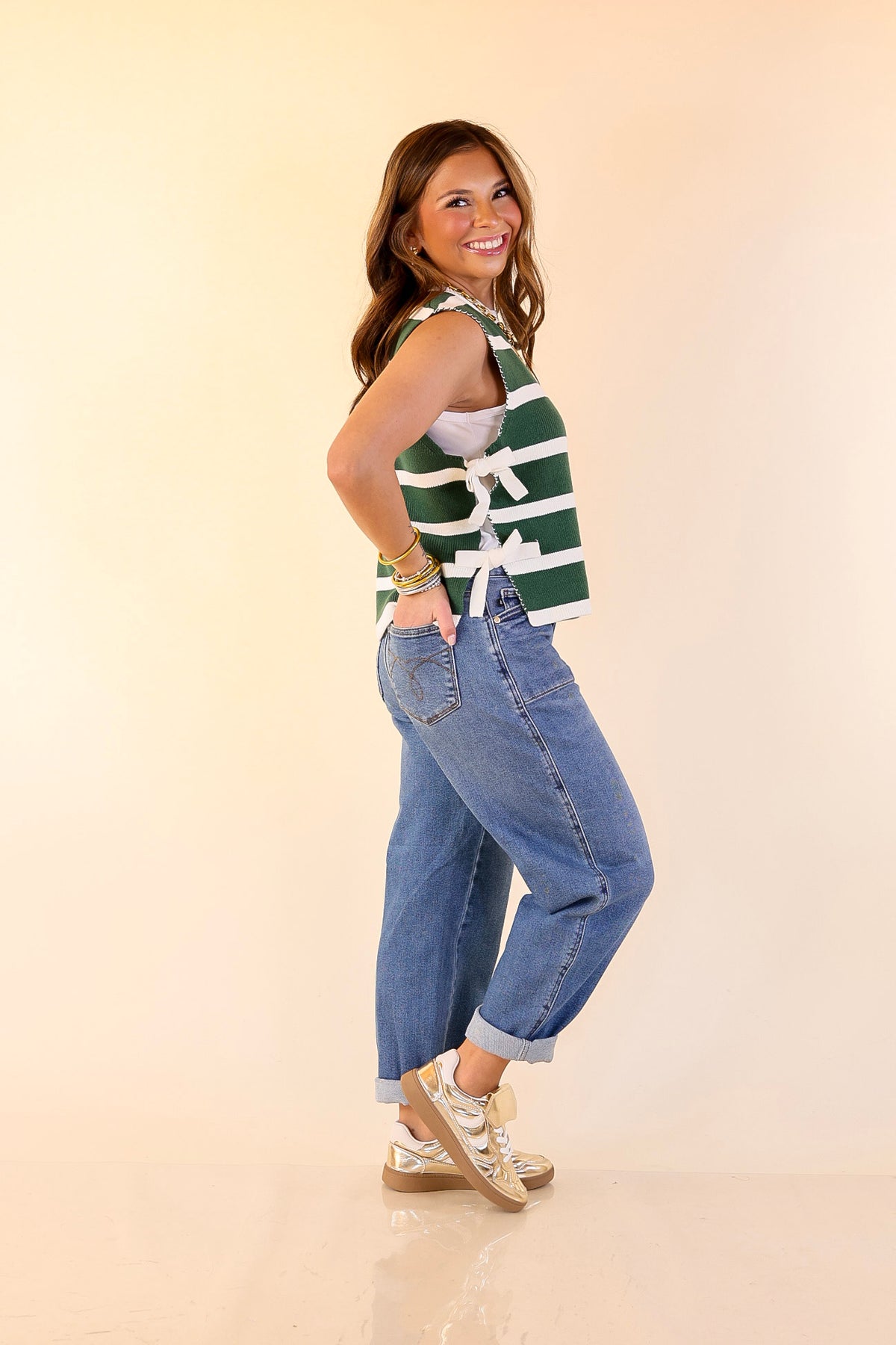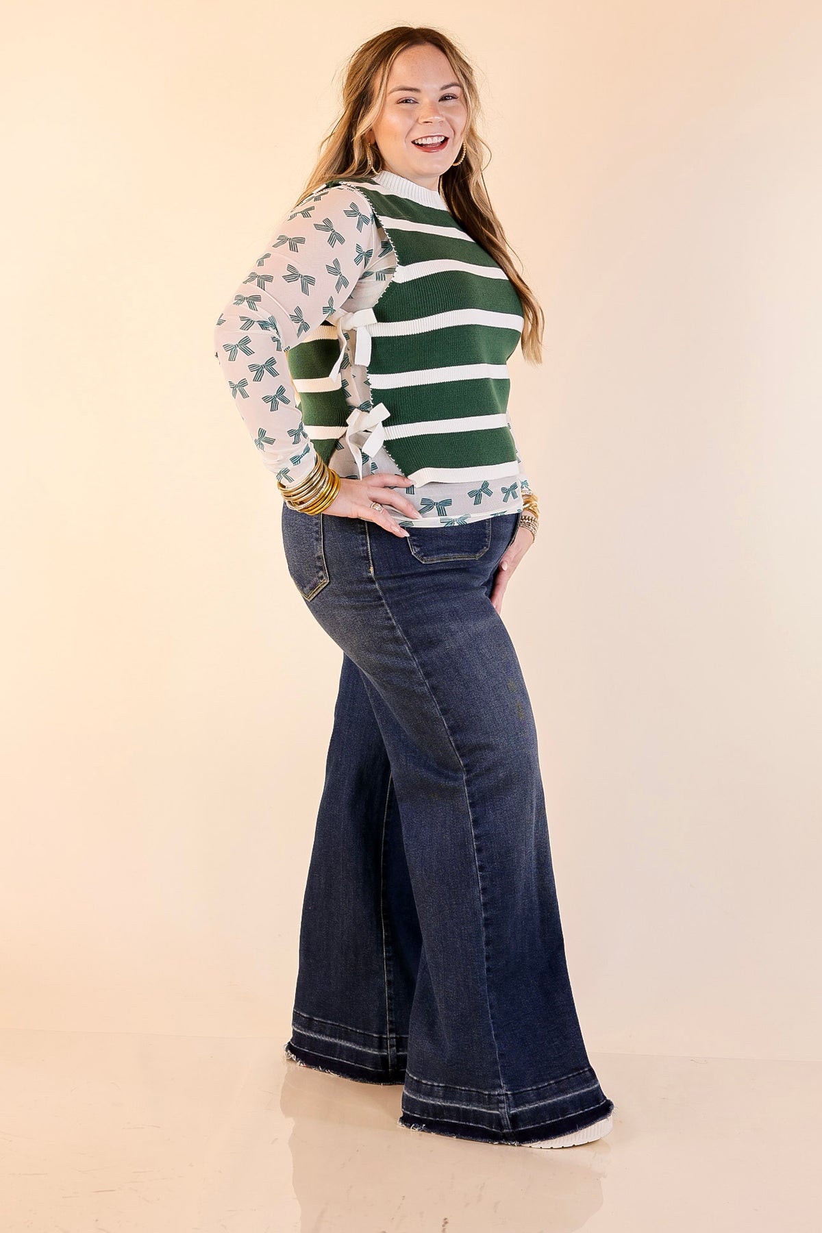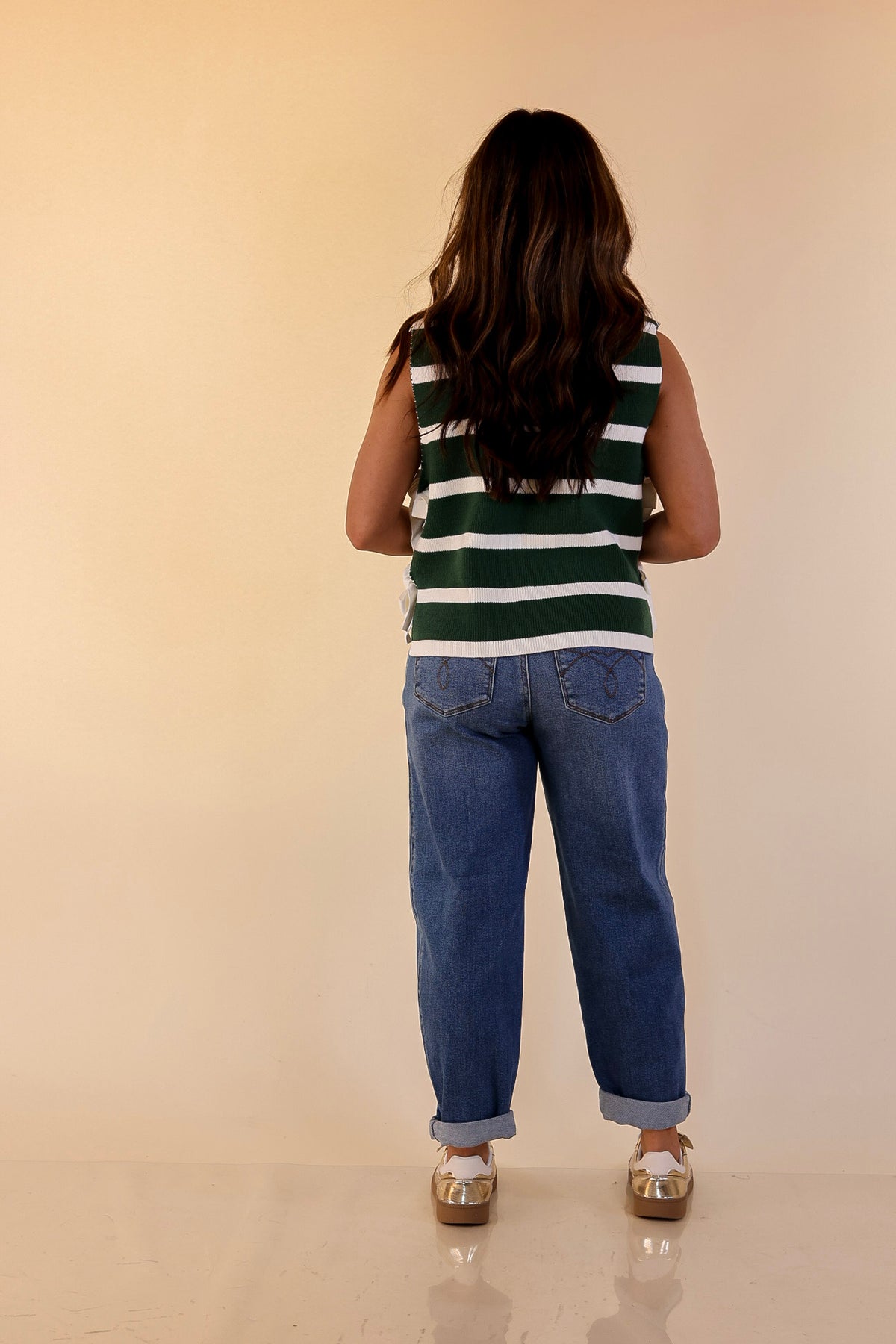 Tied Up in Style Knit Sweater with Side Ties in Forest Green with Off White Stripes