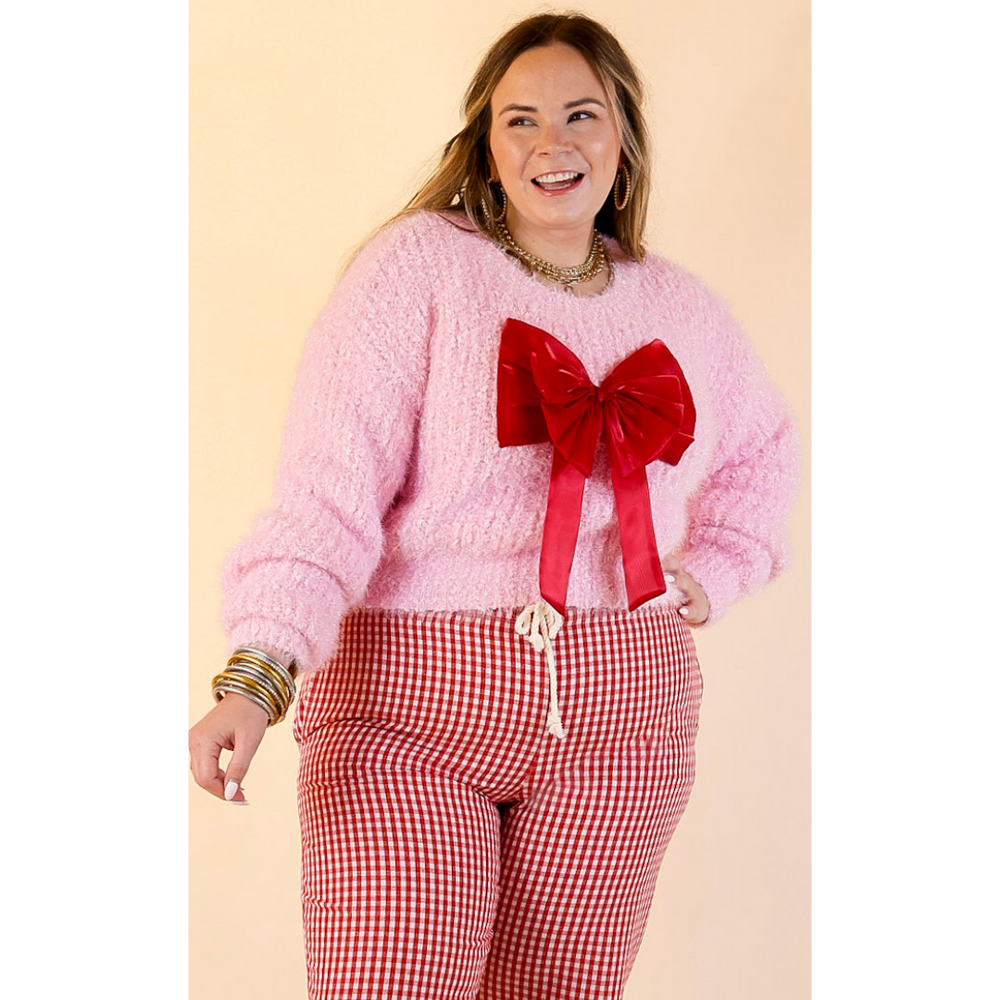 Simply Southern | Tied to Perfection Eyelash Textured Knit Sweater with Red Bow in Pink
