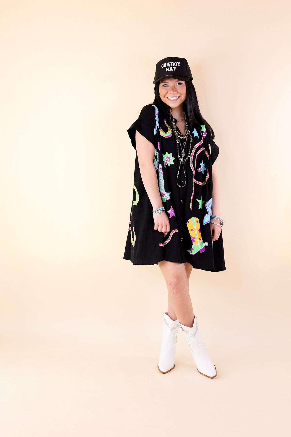 Look effortless and glamorous in this Queen of Sparkles short sleeve graphic dress. Crafted from soft, lightweight fabric, the classic western style is timeless and features a vintage boot and rope icon print. Perfect for any occasion!